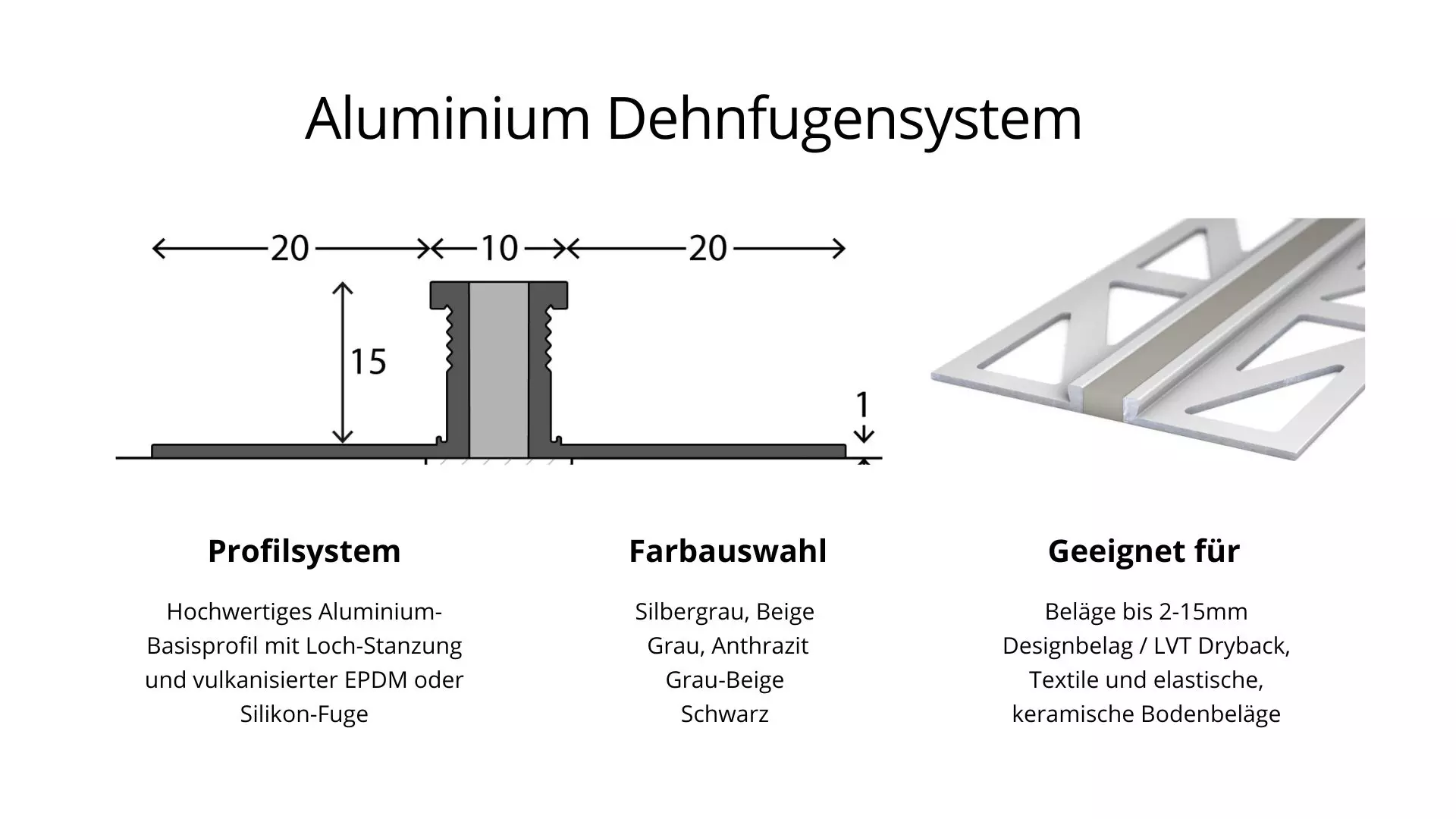 Gefertigt aus hochwertigen Materialien wie Aluminium, Edelstahl oder flexiblem Kunststoff, sind unsere Dehnungsfugenprofile ideal für den Einsatz in Wohnräumen, Büros, industriellen Umgebungen und Außenbereichen. Die Materialien bieten eine hohe Beständigkeit gegen Belastung, Feuchtigkeit und Temperaturschwankungen und passen sich optimal an die Gegebenheiten vor Ort an.