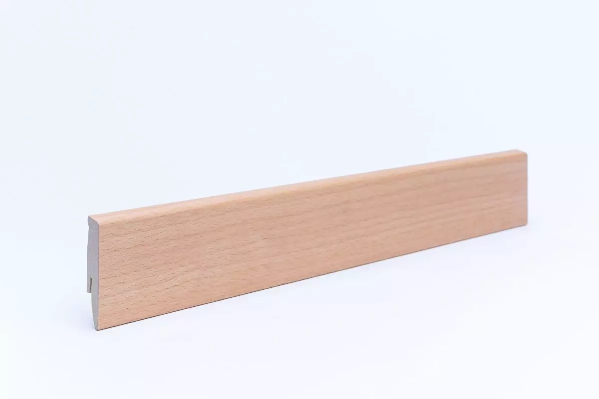 Die Sockelleiste ist mit Echtholz in Buche furniert. Durch die Behandlung mit Holzöl wirkt die Oberfläche wärmer und die natürliche Struktur des Buchenholzes kommt besonders zur Geltung. Das Öl zieht in die Holzporen ein, womit es beständiger gegen Staub, Schmutz und Feuchtigkeit wirkt. Zudem sind unsere Leisten leichter und flexibler als Furnier-Sockelleisten mit Holzkern und passen sich, auch bei leichten Unebenheiten, an Wand und Boden sehr gut an