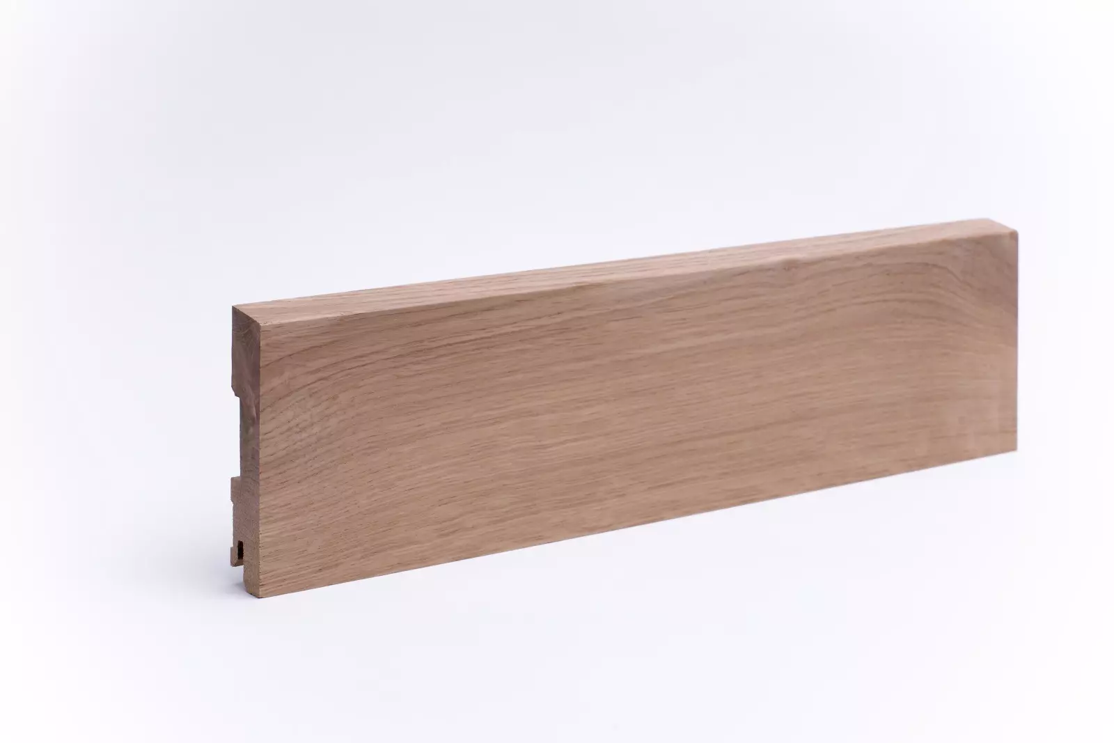 120 mm hohe Sockelleiste aus massivem Eichenholz mit abgeschrägter Vorderkante. Gehobelt und geschliffen. Die Leisten werden aus einem Stück, wie der Stamm gewachsen ist, gearbeitet. Dadurch entsteht ein harmonisches Bild in der Holz- und Farbstruktur. Asteinschlüsse sind möglich.