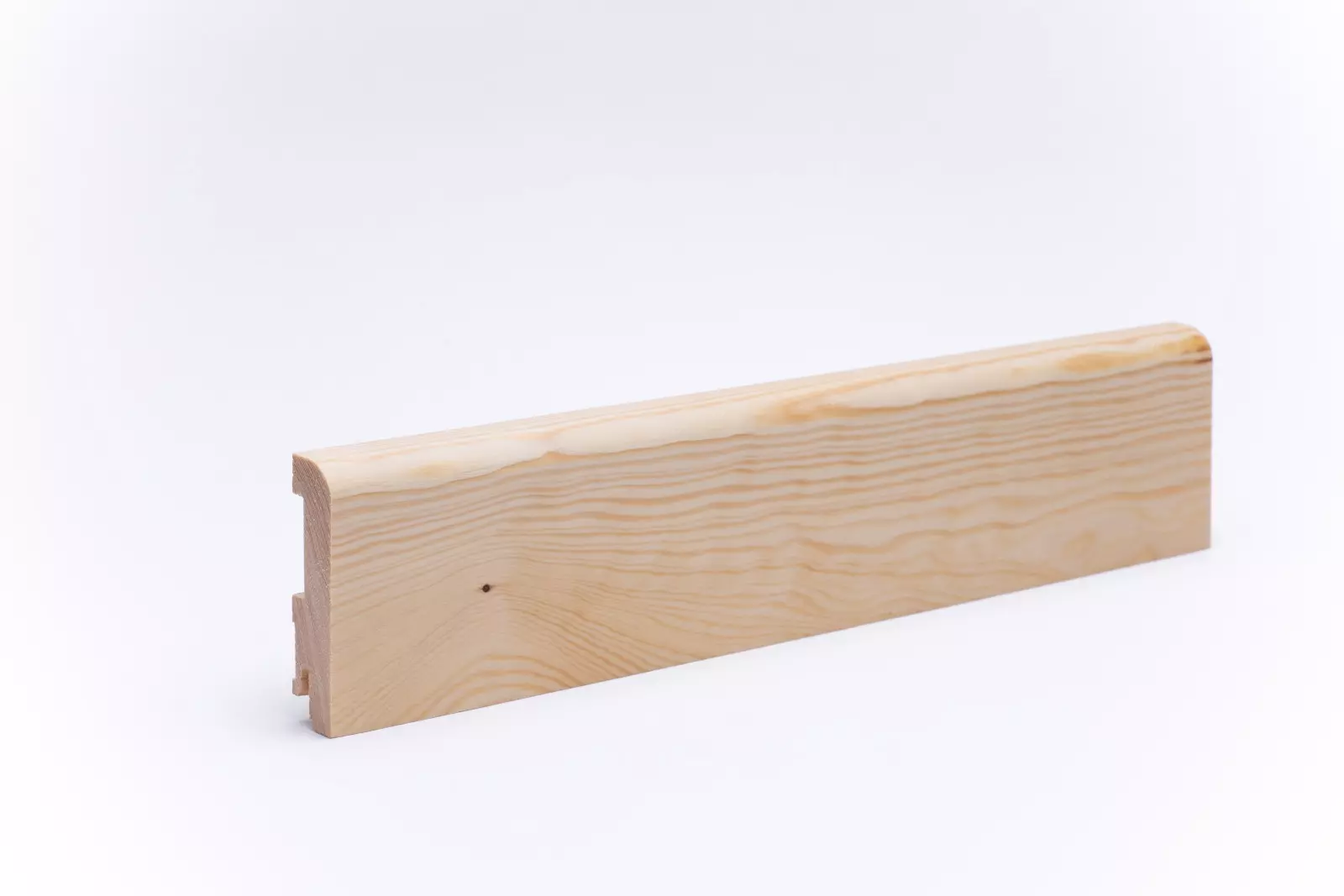 80 mm hohe Sockelleiste aus massivem Kiefernholz mit abgerundeter Vorderkante. Gehobelt und geschliffen. Die Leisten werden aus einem Stück, wie der Stamm gewachsen ist, gearbeitet. Dadurch entsteht ein harmonisches Bild in der Holz- und Farbstruktur. Asteinschlüsse sind möglich.
