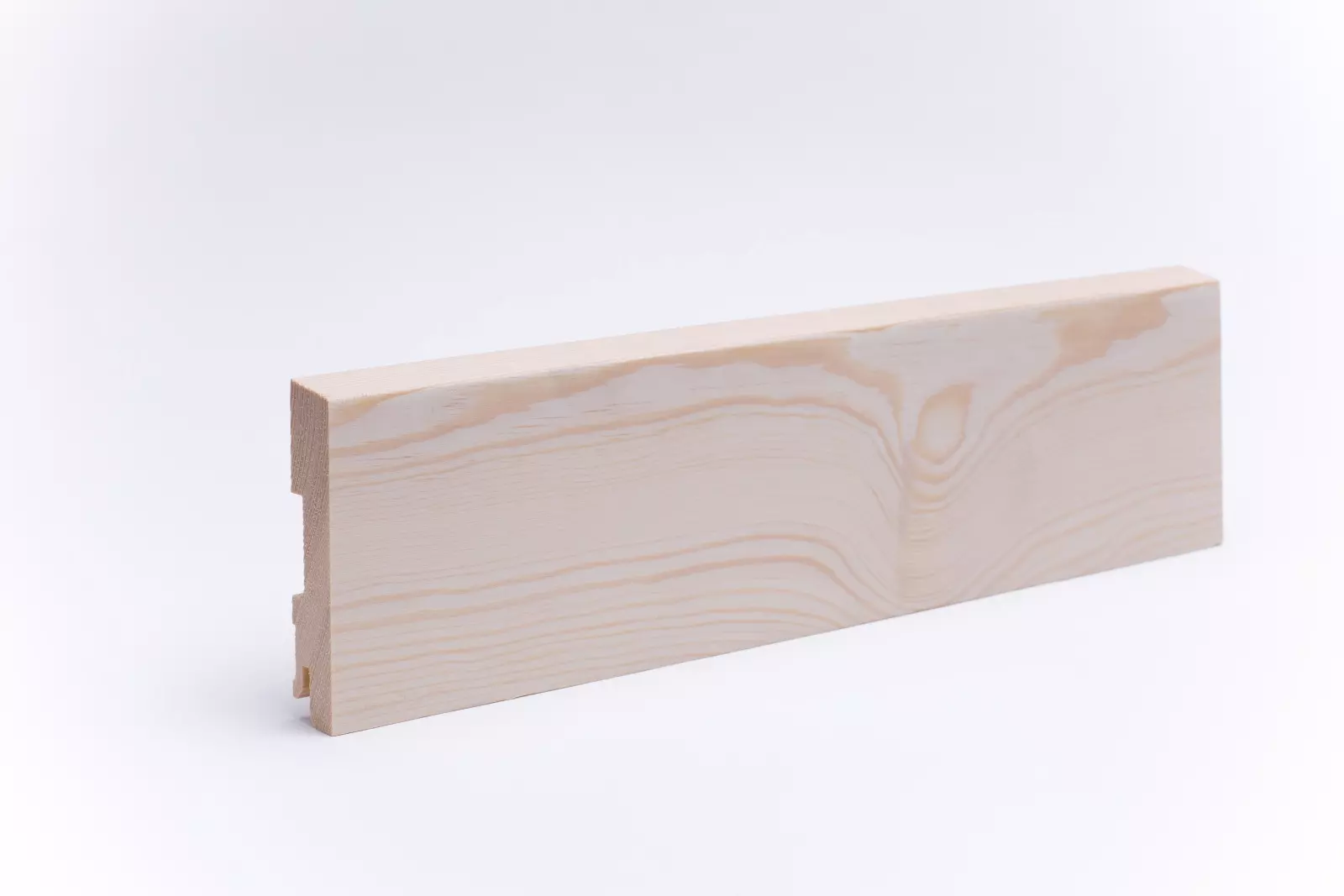 120 mm hohe Sockelleiste aus massivem Kiefernholz mit abgeschrägter Vorderkante. Gehobelt und geschliffen. Die Leisten werden aus einem Stück, wie der Stamm gewachsen ist, gearbeitet. Dadurch entsteht ein harmonisches Bild in der Holz- und Farbstruktur. Asteinschlüsse sind möglich.