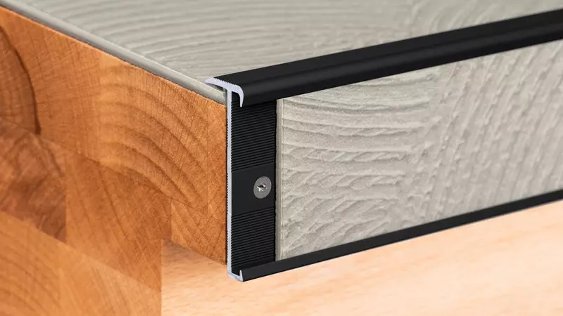 Treppenkantenprofil für Designbeläge von 2-3mm, mit Einschub für eine saubere und schöne Sichtblende jeglicher Kanten wie von Treppen, Podesten oder Vorspüngen.