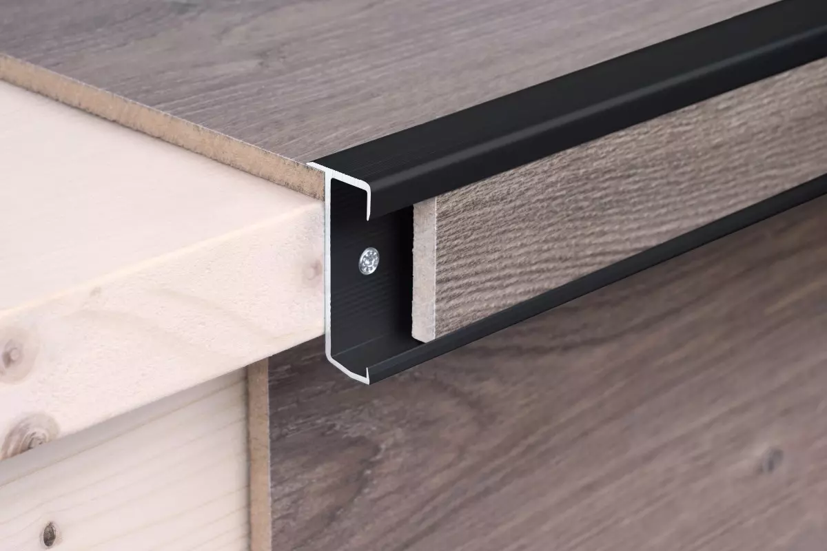 Treppenkantenprofil für Laminat oder Parkett von 7 - 10 mm, mit Einschub für eine saubere und schöne Sichtblende jeglicher Kanten wie von Treppen, Podesten oder Vorspüngen.