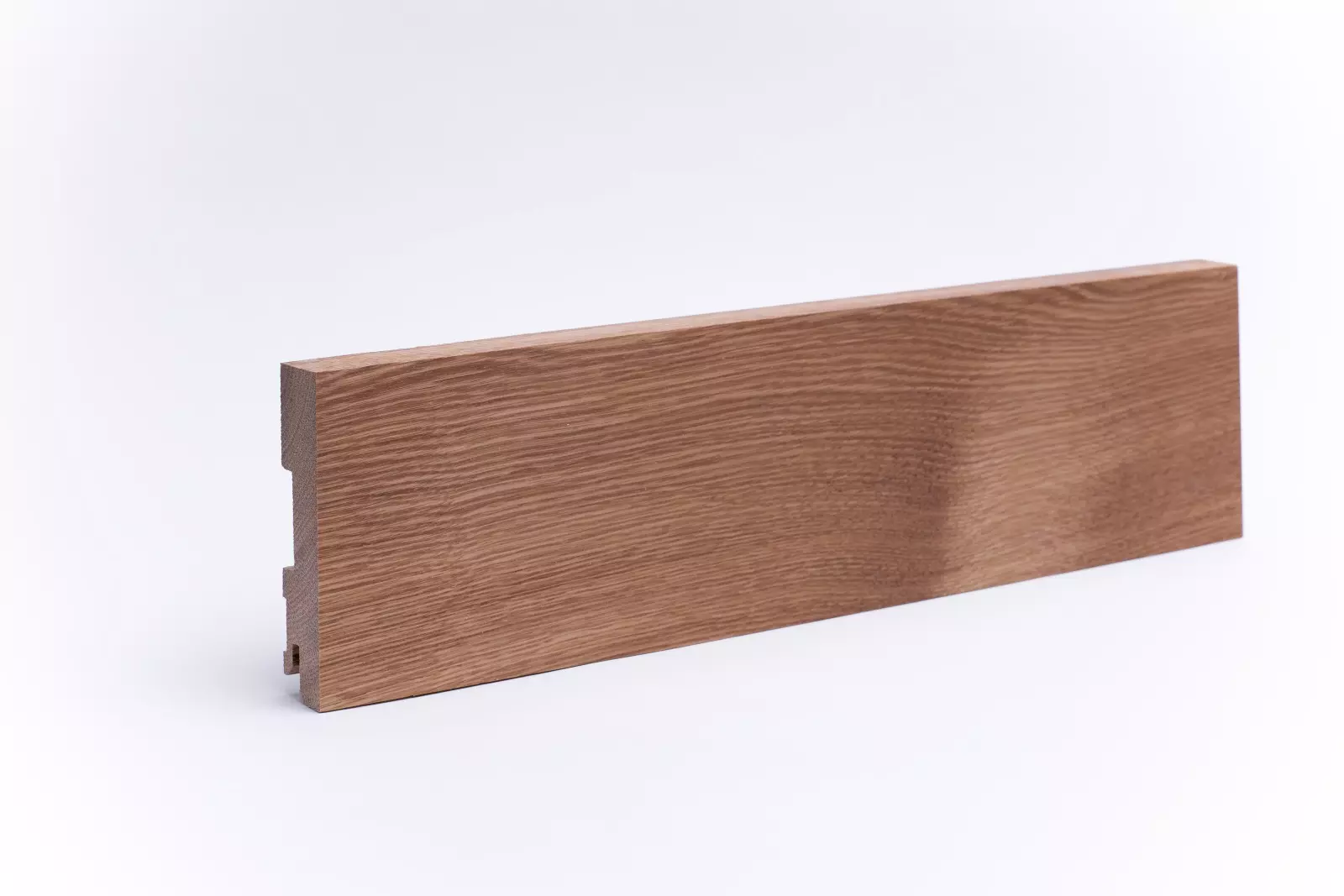 100 mm hohe Sockelleiste aus massivem Eichenholz mit Vierkant-Profil. Gehobelt und geschliffen. Die Leisten werden aus einem Stück, wie der Stamm gewachsen ist, gearbeitet. Dadurch entsteht ein harmonisches Bild in der Holz- und Farbstruktur. Asteinschlüsse sind möglich.