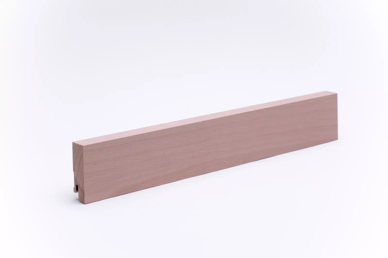 60 mm hohe Rechteck-Sockelleiste aus massivem Buchenholz. Gehobelt und geschliffen. Die Leisten werden aus einem Stück, wie der Stamm gewachsen ist, gearbeitet. Asteinschlüsse sind möglich.