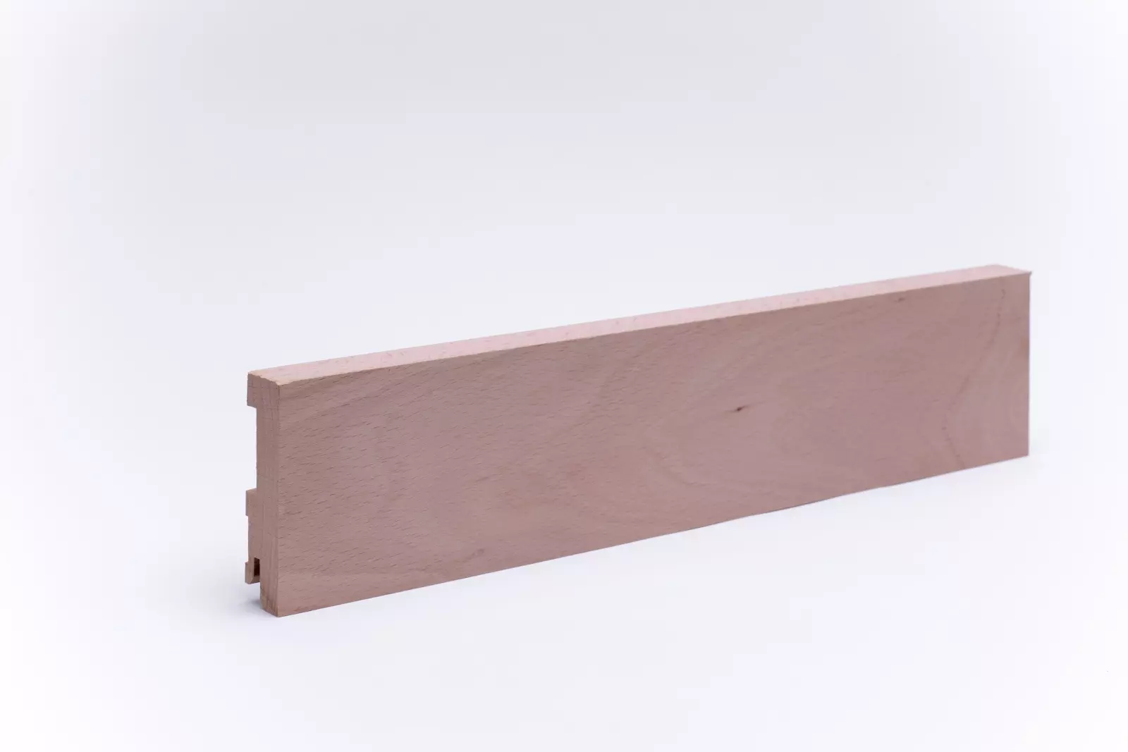80mm hohe Rechteck-Sockelleiste aus massivem Buchenholz mit lackierter Oberfläche . Die Leisten werden aus einem Stück, wie der Stamm gewachsen ist, gearbeitet. Asteinschlüsse sind möglich.