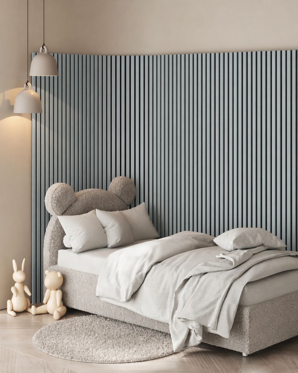 - Aspecto moderno de pared de lamas para mayor profundidad y estructura