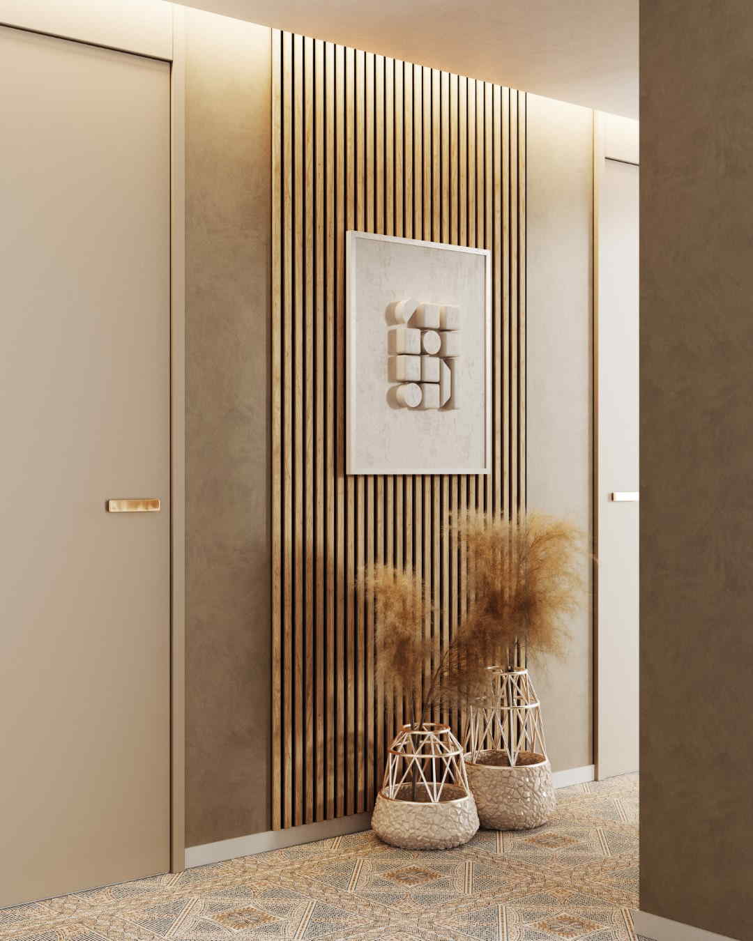 - Aspecto moderno de pared de lamas para mayor profundidad y estructura
