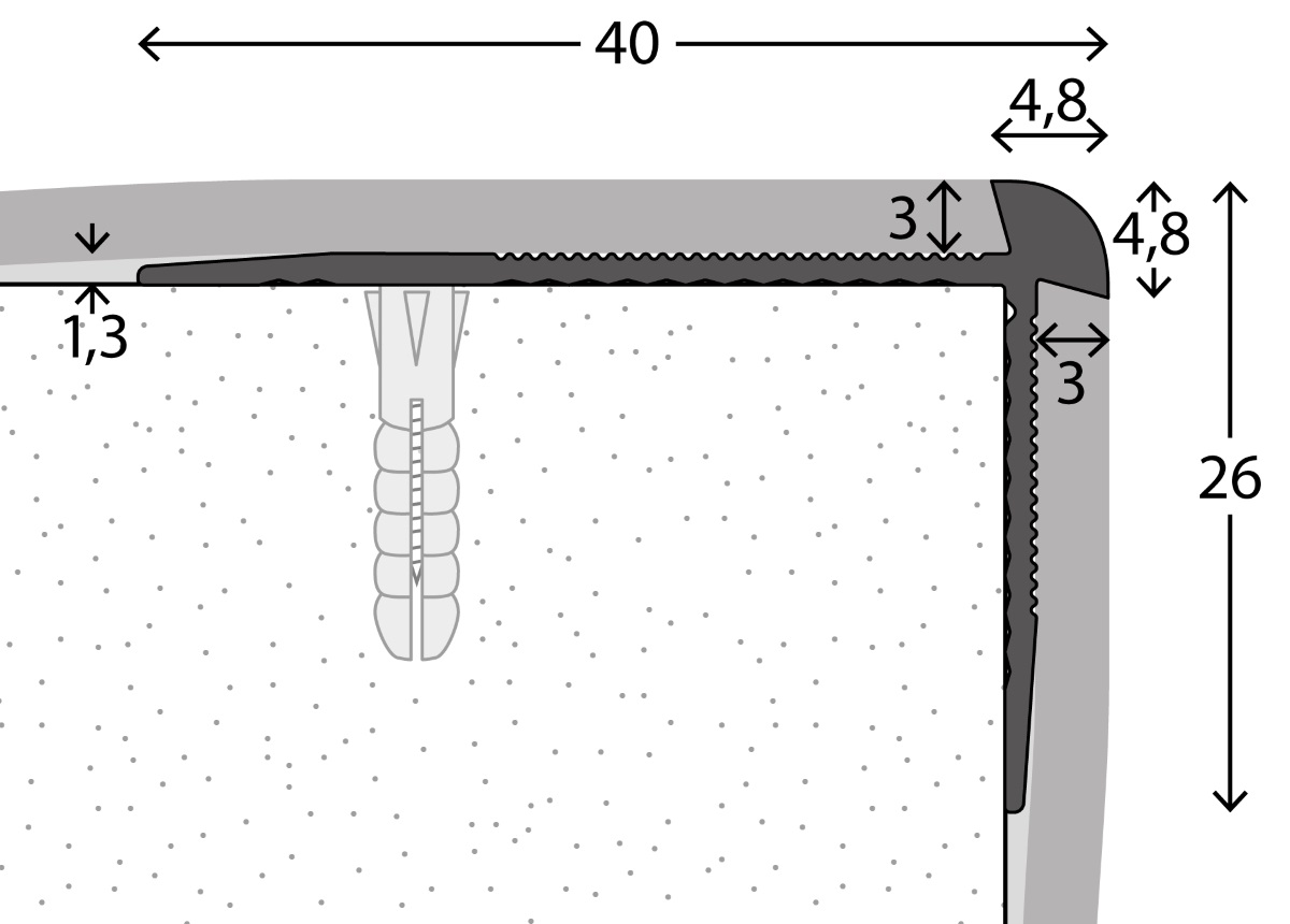 Profil de nez de marche 40 x 26 mm - Noir thermolaquéProfil de nez de marche pour revêtements design jusqu'à 3 mm, pour la pose de revêtements design sur toute la surface des marches d'escalier. Les profilés adaptés protègent les bords du revêtement.Caractéristiques techniquesProfilé en aluminium, revêtu par poudre noirDimensions 40 x 26 x 2.500 mmPour revêtements de sol design / LVT, revêtements de sol élastiques jusqu'à 3 mmtrous de vis encastrés