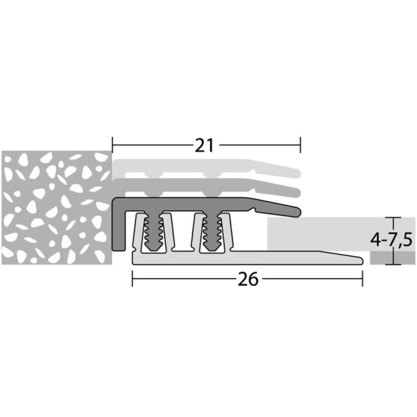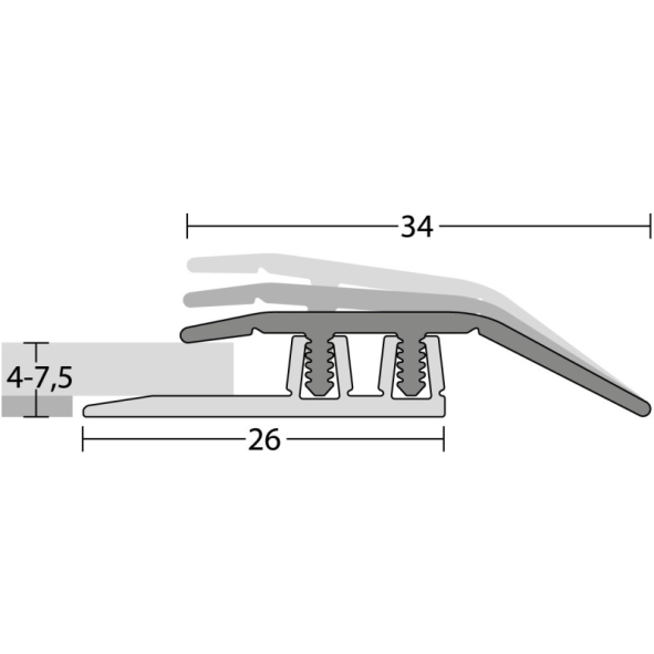PROFI DESIGN transition 270 cm - Le profilé parfait pour les revêtements design.Le système de profilés Design a été spécialement conçu pour les revêtements de sol design / LVT posés de manière flottante.Profil de finition d'aspect particulièrement plat et discretAjustement automatique en hauteur et en inclinaisonmontage rapide, simple et sûrProfil de base inclusLe système de profilés clipsables en aluminium est conçu pour des épaisseurs de revêtement de 4 à 7,5 mm. Grâce au système pratique de clips, ce profilé de transition se monte rapidement et facilement. De plus, il offre un aspect parfait, moderne sans trous de vis, avec suffisamment d'espace pour les joints de dilatation.Aperçu des données techniques.Profil de transition Design - L = 270 cmProfil supérieur : aluminium - anodisé noirProfil de base : PVC durPour hauteurs de montage de 4 - 7,5 mmCompensation de la hauteur jusqu'à 3 mmJoints de dilatation généreux (7 mm)Montage:Le montage du profilé design est particulièrement rapide et simple. Le profilé de base en PVC dur est collé ou vissé sur le support. Ensuite, le profilé de recouvrement est enfoncé dans le profilé de base. Les entretoises dentées du profilé supérieur s'enclenchent alors de manière sûre dans les logements trapézoïdaux du profilé de base. Si nécessaire, le profil supérieur peut être détaché et ensuite ancré à nouveau dans le profil de base.