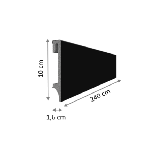 Les plinthes Espumo ESP406 - 100 mm noir Pour l'environnement, 80% de matériaux recyclésLa plinthe Espumo extrêmement robuste et de grande qualité est fabriquée avec une technologie Kerracore spécialement développée à cet effet. La plinthe est composée d'un matériau polymère affiné avec des additifs minéraux. Une couche couche intérieure légère et expansée et la couche extérieure dure rendent la plinthe résistante à l'humidité et aux chocs, ce qui permet de l'utiliser presque partout. Le matériau dans lequel la plinthe Espumo est fabriquée n'absorbe pas l'humidité de la pièce. de la pièce, des murs ou des sols. Elle ne se déforme donc pas et est également idéale pour les nouvelles constructions où les murs dégagent encore de l'humidité pendant un certain temps. Le montage de la plinthe Espumo est particulièrement rapide et simple, car elle est fixée au mur uniquement avec de la colle de montage. Grâce à un guidage de câbles caché, il est en outre possible de faire disparaître les câbles gênants.Aperçu des données :Plinthe en matériaux polymères noir Fabriqué à partir de 80% de matériaux recyclés Dimensions : 100 x 16 x 2400 mm Résistant à l'eau et à l'humidité Canal de câbles intégré Montage : collage
