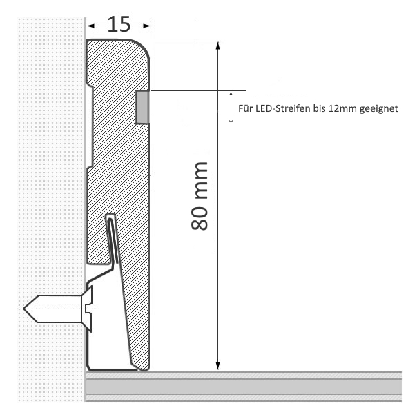 Plinthe LED Profilé de Weimar 80 mm en noirFaites briller votre pièce avec une lumière indirecteNotre Plinthe LED au design classique Profil de Weimar, embellit chaque pièce grâce à son style sobre et intemporel. Grâce au canal LED intégré, votre pièce s'illumine d'une lumière indirecte, créant ainsi une atmosphère chaleureuse et confortableGrâce au simple Système de clips, les plinthes se fixent facilement au mur. Cela permet de couvrir une dimension de 17 mm x 80 mm x 2.000 mm.Type de bois : âme MDF (panneau de fibres de densité moyenne MDF) Pellicule décorative noire Forme : Profilé de Weimar Fixation : Système de clips, collage ou vis Dimensions du plafond : 17 x 80 x 2.000 mm Canal LED intégré pour bande LED jusqu'à 12 mm de largeur Attention ! La bande LED n'est pas comprise dans la livraison. Matériel :La plinthe est composée d'un Ame MDF (panneau de fibres de bois de moyenne densité MDF). Celui-ci confère à la plinthe une flexibilité et une stabilité suffisantes. Le site Le contrecollage décoratif de qualité donne à la plinthe non seulement un aspect magnifique, mais il crée également une propriété protectrice. La surface est ainsi Résiste aux rayures et rend la plinthe d'une grande longévité. En outre, la plinthe dispose d'une bande transparente intégrée. Canal LED en matière plastique en matière plastique, qui permet un un éclairage indirect est produit. Note : la bande LED n'est pas comprise dans la livraison. Montage:Les bandes sont fixées par un Système de clips au mur et peuvent être démontées sans destruction en cas de besoin, par exemple lors de travaux de rénovation. Le canal de câbles intégré vous permet de poser des câbles derrière la plinthe de manière invisible.En alternative, vous pouvez fixer les plinthes avec des Colle pour plinthes, bande adhésive double face ou le Kit de fixation.Dimensions du plafond avec montage par clips : 80 x 17 x 2.000 mm Dimensions du plafond sans montage de clips : 80 x 15 x 2.000 mm . Remarque: Les accessoires nécessaires au montage, comme les clips ou la colle pour plinthes, doivent être commandés séparément.