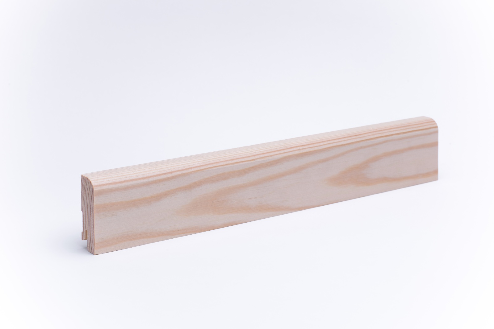 Plinthe de 60 mm de haut en pin massif avec bord avant arrondi. Rabotée et poncée. Les plinthes sont travaillées d'une seule pièce, comme le tronc a poussé. Il en résulte une image harmonieuse au niveau de la structure du bois et de la couleur.