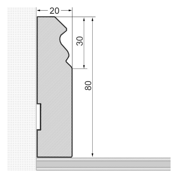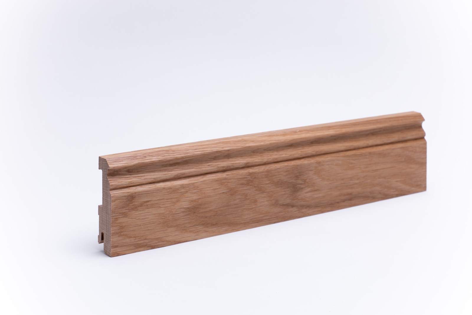 Plinthes en bois massiv avec profil Berlin dans les dimensions 80 mm x 20 mm x 2.400 mm. Les plinthes sont faites d'une pièce, avec la structure naturelle du tronc d'arbre. Ceci crée une image harmonieuse dans la structure de la couleur et du bois.