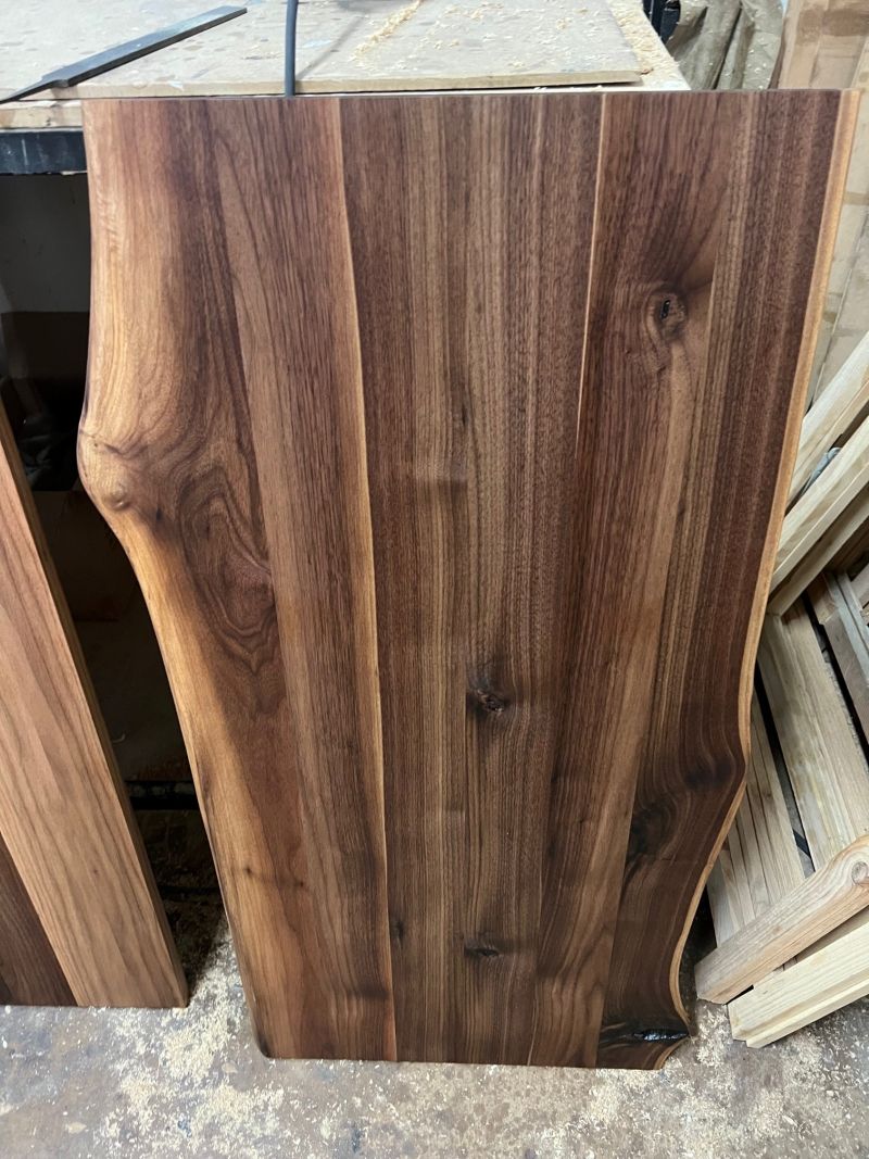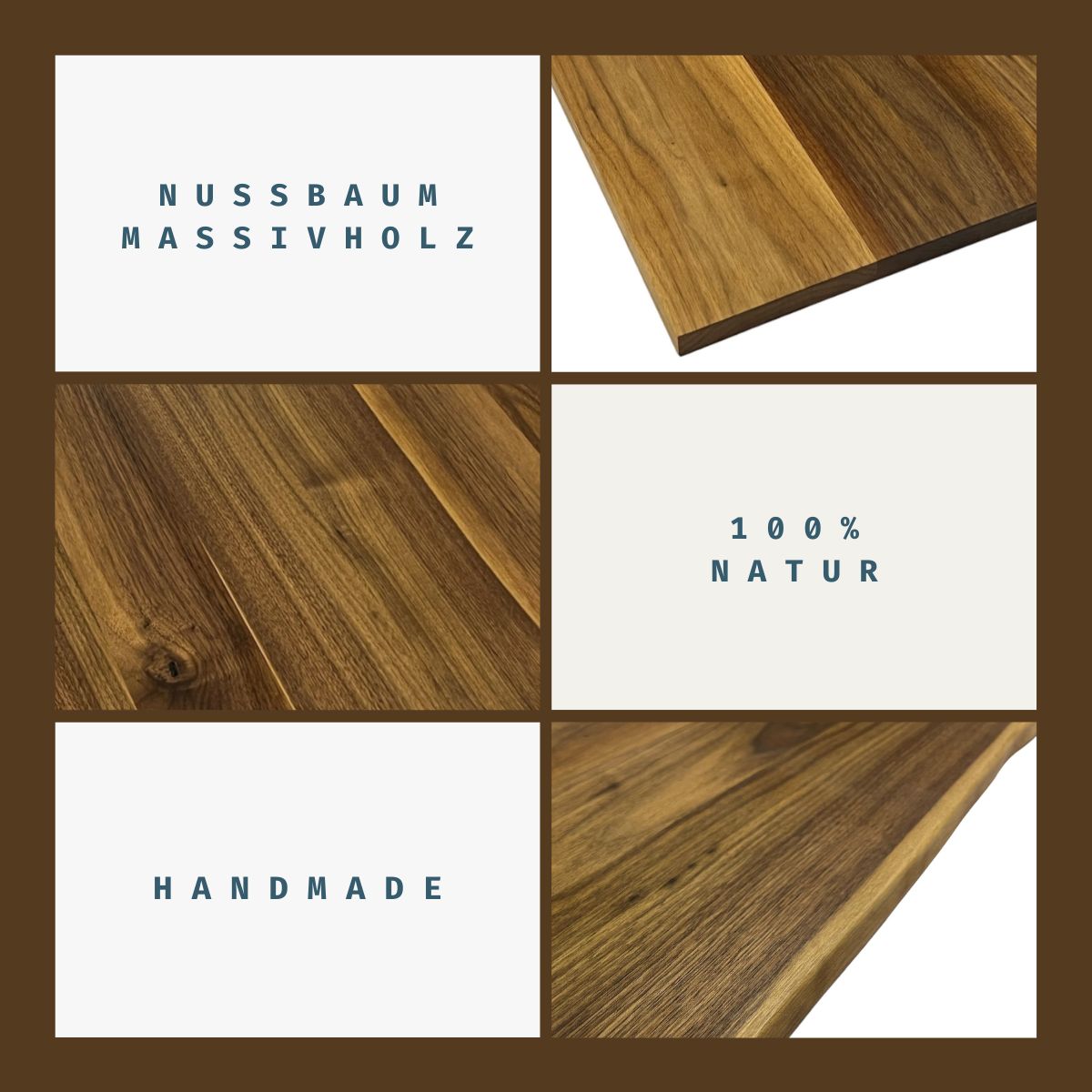 Planche en noyer, planche en noyer, rondelle d'arbre, panneau en bois massif de noyer collé avec chant en forme d'arbre - Naturel - Durable - Caractère Chaque pièce est unique Nos plateaux en noyer avec chants d'arbre des deux côtés sont fabriqués à la main avec amour, à partir de bois massif de qualité supérieure. Pour obtenir la largeur souhaitée, la planche de chêne est collée individuellement à partir de lamelles continues. Il s'agit d'un produit purement naturel, que nous fabriquons en noyer massif. Ainsi, chaque pièce possède son caractère individuel et son charme rustique. Les caractéristiques typiques du bois de noyer sont ainsi conservées:des bords d'arbre naturellement courbés vitesse des veines coloration brun foncé à noir violet aubier blanc à gris rosé Forte différence de couleur entre l'aubier et le duramen Structure avec un éclat presque soyeux Dimensions : longueur : au choix / épaisseur : env. 22 mm / profondeur : au choix Traitement de surface : au choix brut, huilé ou verni. En raison de la courbure naturelle des bords des arbres, la largeur totale de la planche peut varier de +/- 3 cm. De même, l'épaisseur peut varier légèrement. Matériau :Le noyer est un bois très robuste, avec une surface dure et une longue durabilité. Il convient donc parfaitement aux applications les plus diverses, à l'extérieur comme à l'intérieur. Ce produit naturel en bois apporte un caractère naturel. Chaque pièce possède son propre aspect. Grâce à la veinure vive et à la surface légèrement brillante, vous obtenez un produit particulièrement décoratif et noble. Chaque étagère est unique et est fabriquée selon la commande. Le bois de noyer est séché techniquement à environ 8-12% et donc exempt de vermine et de parasites. Les arêtes de l'arbre sont écorcées, rabotées et sur-poncées.Domaine d'utilisation :Excellente utilisation à l'intérieur. Parfaitement adapté aux projets DIY créatifs tels que meubles, plans de travail, décoration murale, garde-robes, etc. Traitement / manipulation :Le bois dur se travaille facilement et proprement avec des outils classiques. Pour les clous et les vis, il est recommandé de prépercer Le traitement de surface choisi :Surface brute: La surface non traitée peut être affinée ultérieurement par décapage, huilage, lasure ou laquage selon vos souhaits. Surface huilée: Un traitement avec l'huile pour bois intensifie la structure naturelle, la surface paraît plus chaude. L'huile protège en outre le bois, ce qui le rend plus résistant à la poussière, à la saleté et à l'humidité. Le bois conserve ainsi son caractère naturel et reste respirant. La structure et les veines naturelles du bois sont ainsi particulièrement mises en valeur. Surface vernie: Un vernis supplémentaire sur la surface, offre une protection optimale contre la poussière, l'humidité et les rayons du soleil. La structure naturelle et le veinage du noyer sont alors entièrement préservés.