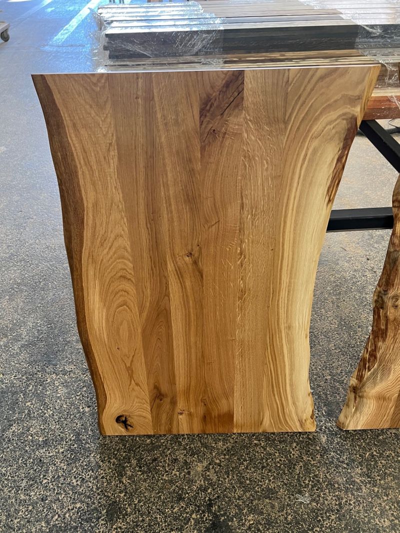 La planche de chêne, le madrier de chêne, la tranche d'arbre, le panneau en bois massif de chêne collé avec chant en forme d'arbre - Naturel - Durable - Caractère Chaque pièce est unique Nos plateaux en chêne avec chant en forme d'arbre des deux côtés sont fabriqués à la main avec amour, à partir de bois massif de qualité supérieure. Pour obtenir la largeur souhaitée, la planche de chêne est collée individuellement à partir de lamelles continues. Il s'agit d'un produit purement naturel, que nous fabriquons en chêne massif. Ainsi, chaque pièce possède son caractère individuel et son charme rustique. Les propriétés typiques du chêne sont ainsi conservées :Chants d'arbre naturellement courbés aubier clair sur la zone des chants bois de cur clair à brun foncé Une veinure et un comportement de couleur uniques bois et nuds caractéristiques Dimensions : longueur : au choix / épaisseur : env. 22 mm / profondeur : au choix Traitement de surface : au choix brut, huilé ou verni. En raison des arêtes naturellement courbées des arbres, la largeur totale de la planche de chêne peut varier de +/- 3 cm. De même, l'épaisseur peut varier légèrement. Matériau :Le chêne est un bois très stable, avec une surface dure et une longue durabilité. Il convient donc parfaitement aux applications les plus diverses en intérieur et en extérieur. Chaque pièce a son aspect individuel. Grâce aux veines vives, aux fissures et aux nuds, vous obtenez un produit à l'aspect rustique et authentique.Le bois de chêne est séché techniquement à environ 8-12% et donc exempt de vermine et de parasites. Les panneaux de bois massif sont dressés sur une face. Le côté de l'arête de l'arbre qui dépasse vers le bas est raboté et poncé. Les chants d'arbres sont écorcés et sur-poncés.Domaine d'utilisation:Excellente utilisation à l'intérieur et à l'extérieur. Mieux adapté aux projets DIY créatifs comme les meubles, les plans de travail, la décoration murale, les penderies, etc. Traitement / manipulation :Le bois dur se travaille facilement et proprement avec des outils classiques.Le traitement de surface choisi :Surface brute: Vous pouvez affiner la surface non traitée ultérieurement, par teinture, huile, lasure ou vernis, selon vos souhaits. Surface huilée: Un traitement avec l'huile pour bois intensifie le ton naturel du chêne, la surface paraît plus chaude. L'huile protège en outre le bois, ce qui le rend plus résistant à la poussière, à la saleté et à l'humidité. Le bois conserve ainsi son caractère naturel et reste respirant. La structure et les veines naturelles du bois sont ainsi particulièrement mises en valeur. Surface vernie: Un vernis supplémentaire sur la surface, offre une protection optimale contre la poussière, l'humidité et les rayons du soleil. La structure naturelle et le veinage du chêne sont alors entièrement préservés.