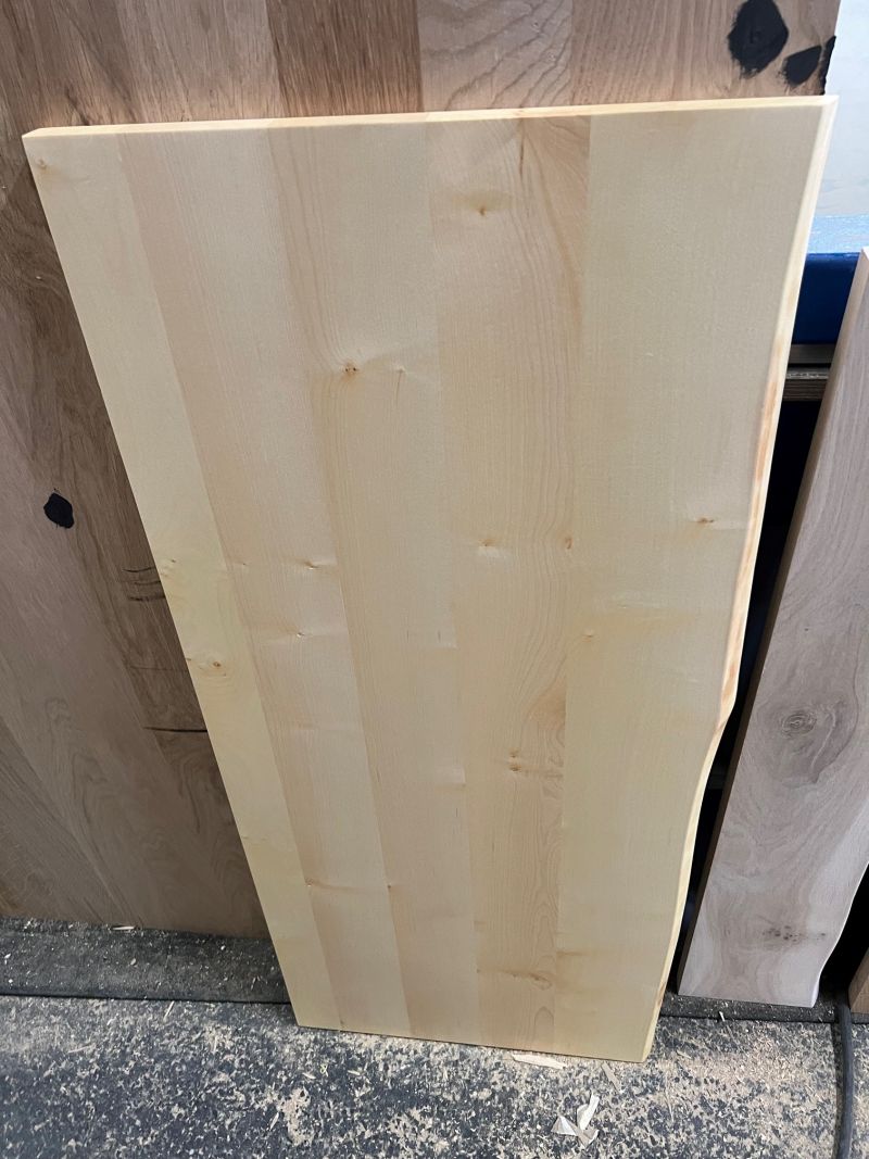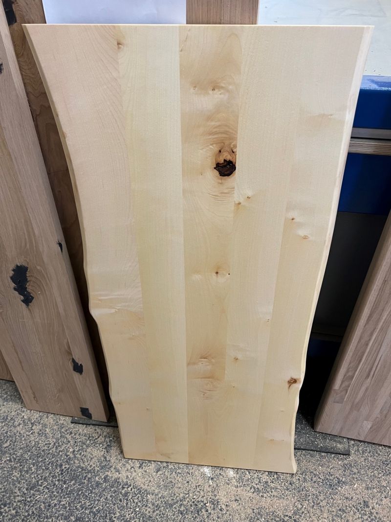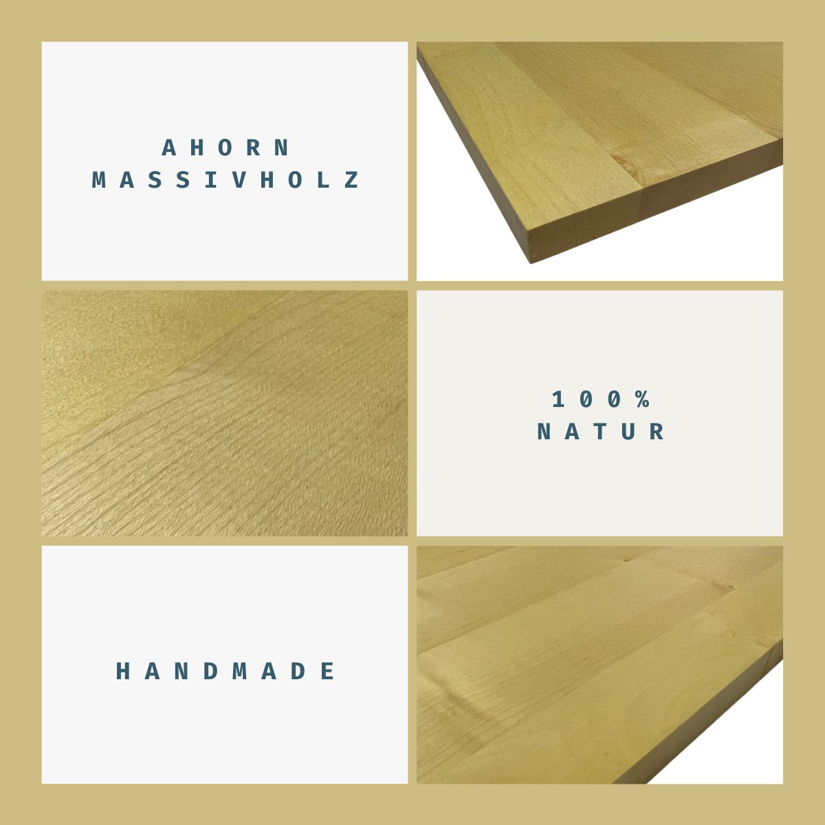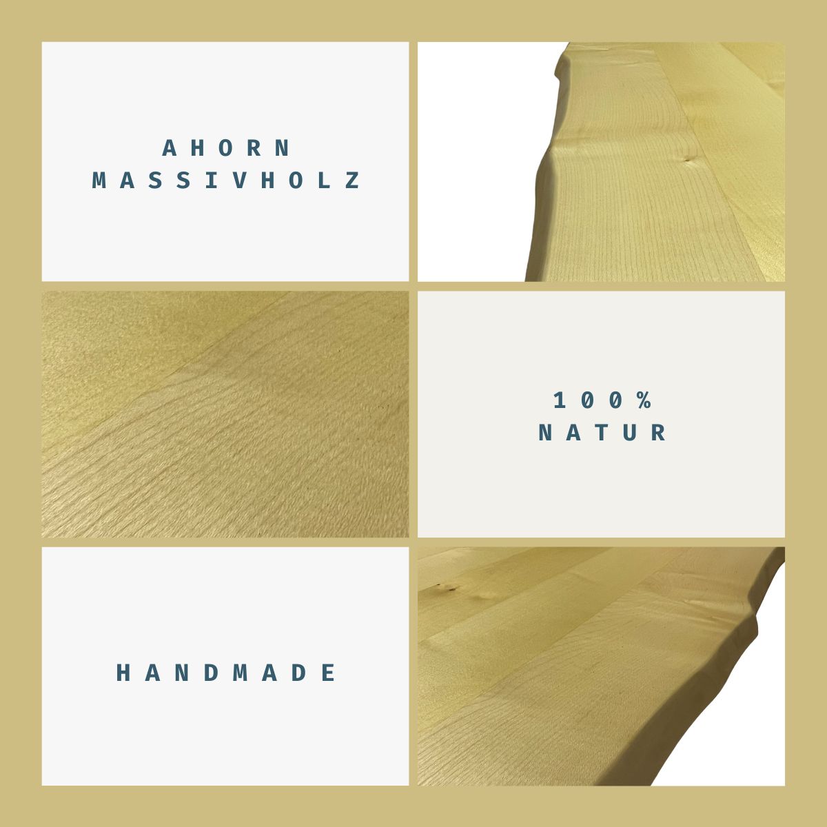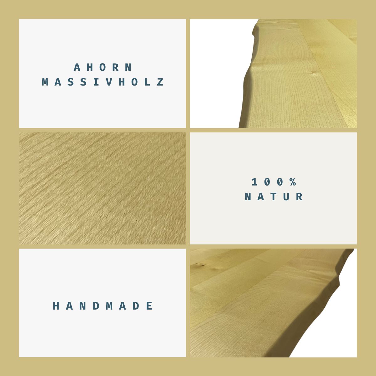Planche d'érable, madrier d'érable, rondelle d'arbre, panneau en bois massif d'érable collé avec chant en forme d'arbre - Naturel - Durable - Caractère Chaque pièce est unique Nos plaques d'érable avec chant en forme d'arbre des deux côtés sont fabriquées à la main avec amour, à partir de bois massif de qualité supérieure. Pour obtenir la largeur souhaitée, la planche est collée individuellement à partir de lamelles continues. Il s'agit d'un produit purement naturel que nous fabriquons à partir de bois d'érable massif. Ainsi, chaque pièce possède son caractère individuel et son charme rustique. Les caractéristiques typiques du bois d'érable sont ainsi conservées:Chants d'arbre naturellement courbés coloration blanche brillante à légèrement jaunâtre sans coloration du cur Structuration fine et régulière bois et nuds caractéristiques Dimensions : longueur : au choix / épaisseur : env. 22 mm / profondeur : au choix Traitement de surface : au choix brut, huilé ou verni. En raison de la courbure naturelle des bords des arbres, la largeur totale de la planche peut varier de +/- 3 cm. De même, l'épaisseur peut varier légèrement.Matériau :L'érable est un bois très robuste, avec une surface dure et une longue durabilité. Il convient donc parfaitement aux applications les plus diverses en intérieur. Ce produit naturel en bois apporte un caractère naturel. Chaque pièce possède son propre aspect. Grâce à la structure régulière et aux pores fins, vous obtenez un produit intemporel et noble. Le bois d'érable est séché techniquement à environ 8-12% et donc exempt de vermine et de parasites. Les arêtes des arbres sont écorcées, rabotées et sur-poncées. Domaine d'utilisation :Excellente utilisation à l'intérieur. Parfaitement adapté aux projets DIY créatifs tels que meubles, plans de travail, décoration murale, garde-robes, etc. Traitement / manipulation :Le bois dur se travaille facilement et proprement avec des outils classiques.Le traitement de surface choisi :Surface brute: Vous pouvez affiner la surface non traitée ultérieurement, par teinture, huilage, lasure ou laquage selon vos souhaits. Surface huilée: Un traitement avec de l'huile pour bois intensifie la structure naturelle, la surface paraît plus chaude. L'huile protège en outre le bois, ce qui le rend plus résistant à la poussière, à la saleté et à l'humidité. Le bois conserve ainsi son caractère naturel et reste respirant. La structure et les veines naturelles du bois sont ainsi particulièrement mises en valeur. Surface vernie: Un vernis supplémentaire sur la surface, offre une protection optimale contre la poussière, l'humidité et les rayons du soleil. La structure naturelle et le veinage du bois d'érable sont alors entièrement préservés.