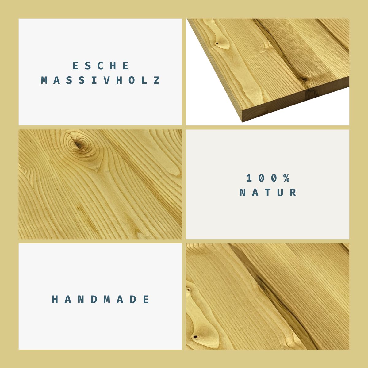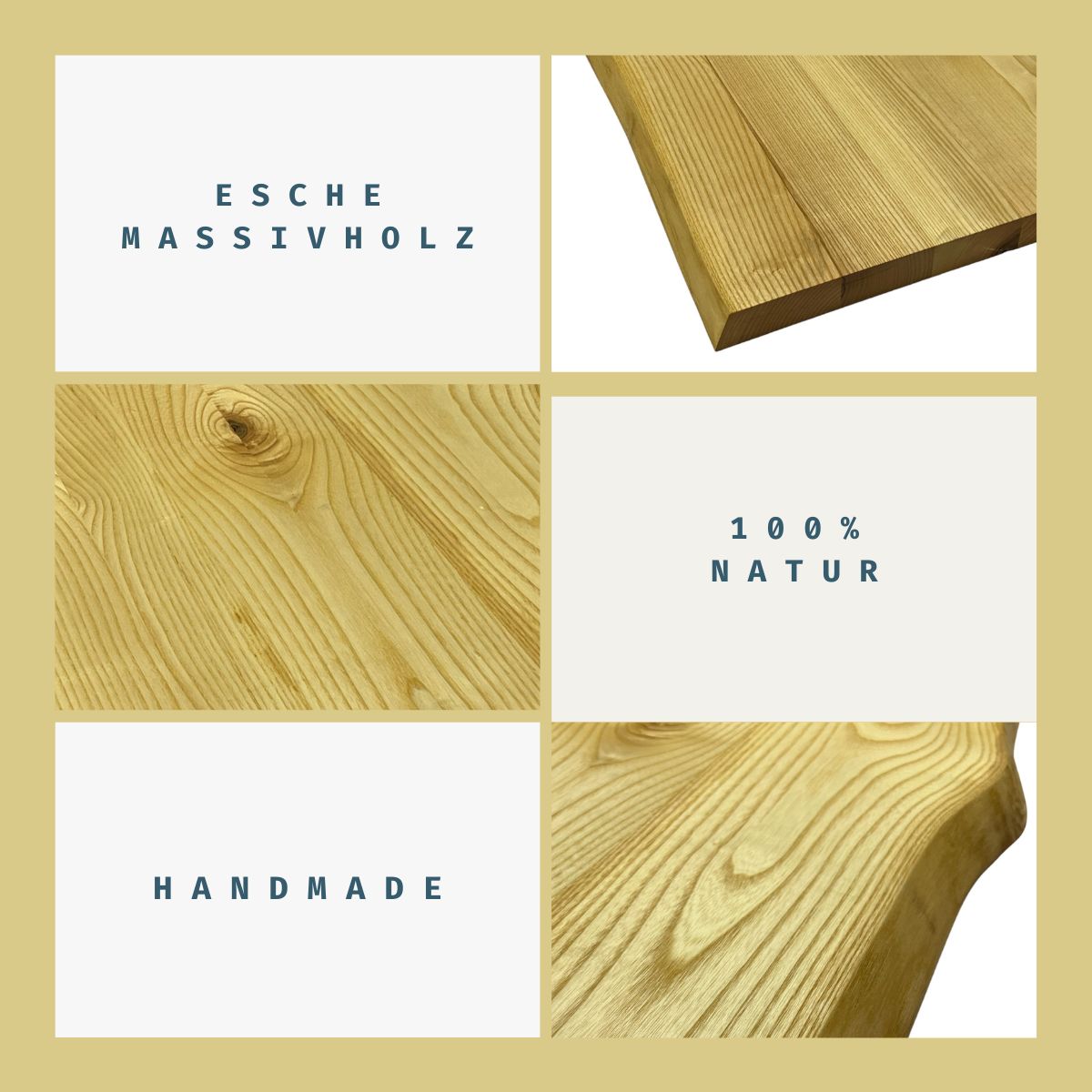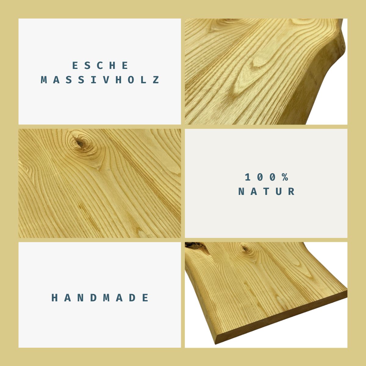 Eschenbrett, Regalbrett, Massivholzplatte aus verleimtem Eschenholz mit beidseitiger Baumkante - Natürlich - Langlebig - Charaktervoll - Länge 100 cm x Breite 50 - 54 cm Bringen Sie die Natur in Ihr Zuhause Unsere Eschenplatten mit Baumkante und einseitig besäumt, werden in liebevoller Handarbeit, aus hochwertigem Massivholz hergestellt. Um die gewünschte Breite zu erreichen, wird das Eschenbrett individuell aus durchgehenden Lamellen verleimt. Es handelt sich um ein reines Naturprodukt, welches wir aus massivem Eschenholz fertigen - so wie der Stamm gewachsen ist. Dadurch besitzt jedes Stück seinen individuellen Charakter. Die Eschenholz typischen Eigenschaften bleiben dabei erhalten und können vorhanden sein: natürlich geschwungene Baumkanten helles Holz mit nordischer Klarheit breites, weißes bis leicht gelbliches Splintholz Kernholz mitunter dunkler einzigartige und kräftige Maserung häufige marmorierte Zeichnung Abmessung: Länge 100 cm x Breite 50 - 54 cm x Stärke 40mm (Bitte beachten Sie, die angegebenen Breiten sind jeweils die Mindest- und Maximalbreite der Massivholzplatte.)