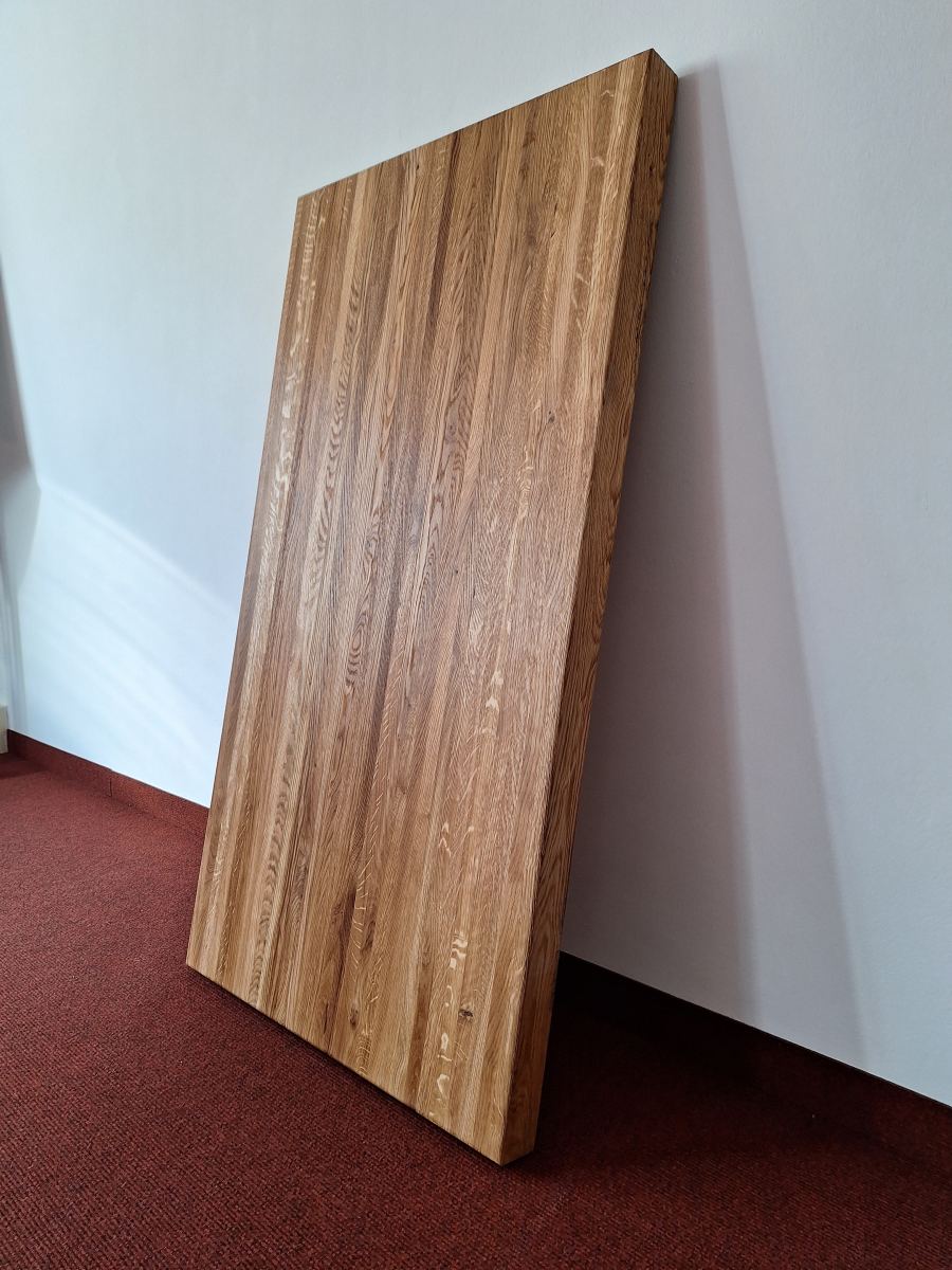 Panneau en bois massif - plateau de table épaisseur 22 mm - chêne naturel Chaque enregistrement est uniqueNos panneaux en bois de chêne massif d'une épaisseur de 22 mm sont collés à la main avec des lattes en une seule pièce et assurent ainsi un véritable accroche-regard et un climat ambiant agréable. Le grain vif du chêne vous donne un produit avec un aspect naturel et authentique Vous avez la possibilité de configurer votre assiette selon vos idées. Le bois de chêne offre de nombreuses propriétés positives, un grain intense et est considéré comme très durable. Le chêne est naturellement très résistant aux intempéries et résilient. La robustesse, la durabilité et la longévité sont des propriétés particulièrement remarquables. Le bois est techniquement séché à environ 8-12 % et donc exempt de vermine et de parasites, ce qui rend le panneau parfait pour une utilisation en intérieur qui convient. Le miroir en bois caractéristique, la teneur en branches et en aubier font de chaque panneau en bois massif une pièce individuelle - avec un caractère unique et aspect authentique. Sélectionnable dans le configurateurLe raffinement de surfacePoncé et non traité - dans cette version, vous avez la possibilité d'utiliser le panneau non traité ou de le traiter par la suite. Vous pouvez personnaliser votre plateau de table en le teintant, le fumant, le glacis ou le vernissant par exemple modifier et concevoir.Poncé et huilé - Le traitement à l'huile de bois intensifie le ton naturel du chêne, la surface paraît plus chaude. L'huile protège en outre la plaque, la rendant plus résistante à la poussière, à la saleté et à l'humidité. Ce faisant, conserve le bois son naturel et reste respirant. La structure naturelle et le grain du chêne prennent tout leur sens et font de votre planche un véritable accroche-regard.Conseils pour le nettoyage et l'entretien : Essuyez simplement les salissures mineures enlever avec un chiffon humide (sans produit de nettoyage). Il est important de ne pas utiliser de chiffons en microfibre, car ils peuvent rayer la surface et absorber l'huile. Selon le degré d'usure, nous recommandons de nettoyer la plaque une à deux fois par an avec un être traité avec de l'huile de bois. Poncé et verni - Le vernissage du panneau offre une protection optimale contre l'humidité, la saleté et la lumière du soleil. Malgré le vernissage, la structure naturelle du chêne est entièrement préservée. Nettoyer le peint Le dessus de table est simple, la saleté et les taches peuvent être facilement enlevées avec un chiffon humide.Le profil de bordChoisissez votre profil de bord du plateau de table parmi 5 options différentes. Selon votre sélection, les bords sont ensuite traités pour vous avec une fraiseuse de surface. Vous avez des demandes particulières qui ne sont pas disponibles dans le configurateur ?Veuillez nous contacter par e-mail à info@leiste24.de et nous essaierons de rendre possible une production spéciale pour vous.