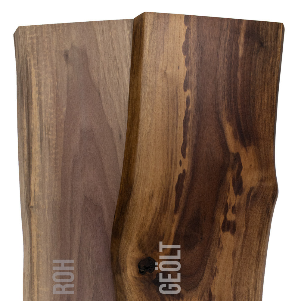 Planche en noyer, planche en noyer, rondelle d'arbre, panneau en bois massif de noyer collé avec chant en forme d'arbre - Naturel - Durable - Caractère Chaque pièce est unique Nos plateaux en noyer avec chants d'arbre des deux côtés sont fabriqués à la main avec amour, à partir de bois massif de qualité supérieure. Pour obtenir la largeur souhaitée, la planche de chêne est collée individuellement à partir de lamelles continues. Il s'agit d'un produit purement naturel, que nous fabriquons en noyer massif. Ainsi, chaque pièce possède son caractère individuel et son charme rustique. Les caractéristiques typiques du bois de noyer sont ainsi conservées:des bords d'arbre naturellement courbés vitesse des veines coloration brun foncé à noir violet aubier blanc à gris rosé Forte différence de couleur entre l'aubier et le duramen Structure avec un éclat presque soyeux Dimensions : longueur : au choix / épaisseur : env. 22 mm / profondeur : au choix Traitement de surface : au choix brut, huilé ou verni. En raison de la courbure naturelle des bords des arbres, la largeur totale de la planche peut varier de +/- 3 cm. De même, l'épaisseur peut varier légèrement. Matériau :Le noyer est un bois très robuste, avec une surface dure et une longue durabilité. Il convient donc parfaitement aux applications les plus diverses, à l'extérieur comme à l'intérieur. Ce produit naturel en bois apporte un caractère naturel. Chaque pièce possède son propre aspect. Grâce à la veinure vive et à la surface légèrement brillante, vous obtenez un produit particulièrement décoratif et noble. Chaque étagère est unique et est fabriquée selon la commande. Le bois de noyer est séché techniquement à environ 8-12% et donc exempt de vermine et de parasites. Les arêtes de l'arbre sont écorcées, rabotées et sur-poncées.Domaine d'utilisation :Excellente utilisation à l'intérieur. Parfaitement adapté aux projets DIY créatifs tels que meubles, plans de travail, décoration murale, garde-robes, etc. Traitement / manipulation :Le bois dur se travaille facilement et proprement avec des outils classiques. Pour les clous et les vis, il est recommandé de prépercer Le traitement de surface choisi :Surface brute: La surface non traitée peut être affinée ultérieurement par décapage, huilage, lasure ou laquage selon vos souhaits. Surface huilée: Un traitement avec l'huile pour bois intensifie la structure naturelle, la surface paraît plus chaude. L'huile protège en outre le bois, ce qui le rend plus résistant à la poussière, à la saleté et à l'humidité. Le bois conserve ainsi son caractère naturel et reste respirant. La structure et les veines naturelles du bois sont ainsi particulièrement mises en valeur. Surface vernie: Un vernis supplémentaire sur la surface, offre une protection optimale contre la poussière, l'humidité et les rayons du soleil. La structure naturelle et le veinage du noyer sont alors entièrement préservés.