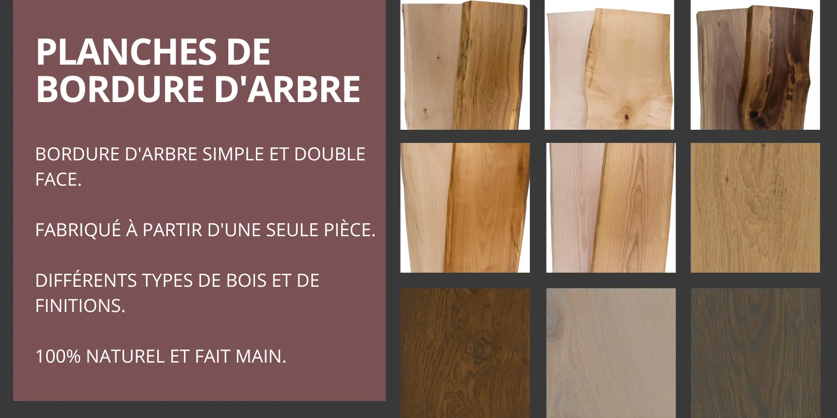Caractéristiques de nos planches en bois massif avec chant en forme d'arbre sur une face: