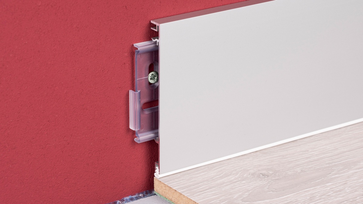 Plinthes en aluminium pour une transition élégante et attirant entre le mur et le plancher. Le canal de clip intégré permet la pose de câbles invisible derrière les plinthes .