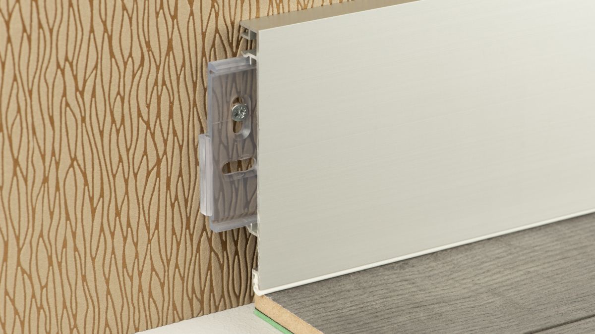 Plinthes en aluminium pour une transition élégante et attirant entre le mur et le plancher. Le canal de clip intégré permet la pose de câbles invisible derrière les plinthes .