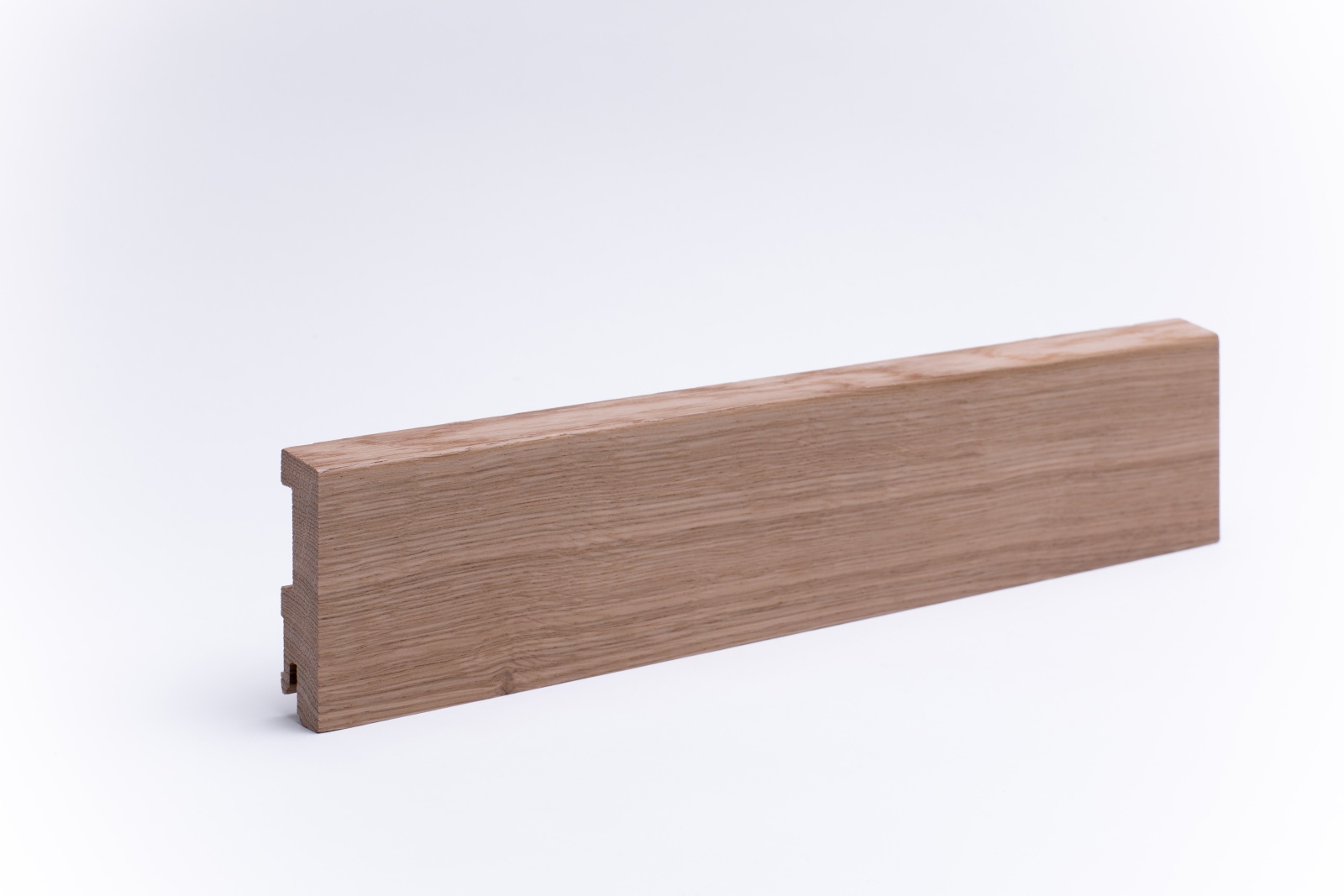 Plinthes en bois massiv avec à bord biseauté dans les dimensions 80 mm x 20 mm x 1.000 - 2.400 mm. Les plinthes sont faites d'une pièce, avec la structure naturelle du tronc d'arbre. Ceci crée une image harmonieuse dans la structure de la couleur et du bois.