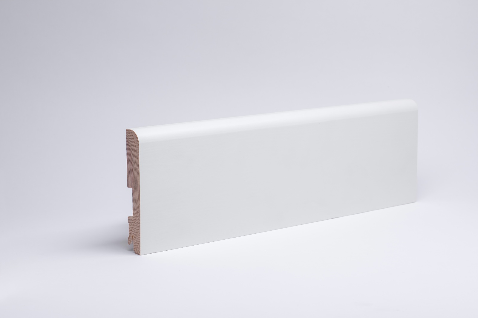 Les plinthes sont fabriquées en pin massif de haute qualité, ce qui leur confère une résistance et une durée de vie. La surface est laquée en blanc couvrant dans la teinte moderne RAL9010. Le vernis de haute qualité protège en outre le bois contre les influences extérieures et crée un magnifique aspect avec des veines de bois uniques.