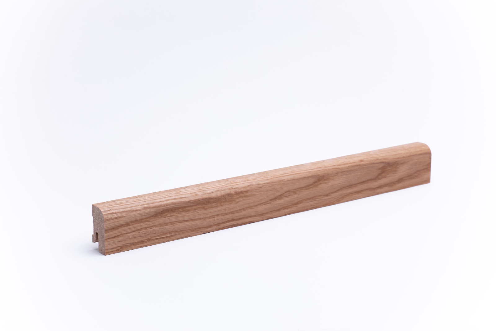 Plinthe de 40 mm de haut en chêne massif avec bord avant arrondi. Rabotée et poncée. Les plinthes sont travaillées d'une seule pièce, comme le tronc a poussé. Il en résulte une image harmonieuse au niveau de la structure du bois et de la couleur. Des finitions en pierre sont possibles.