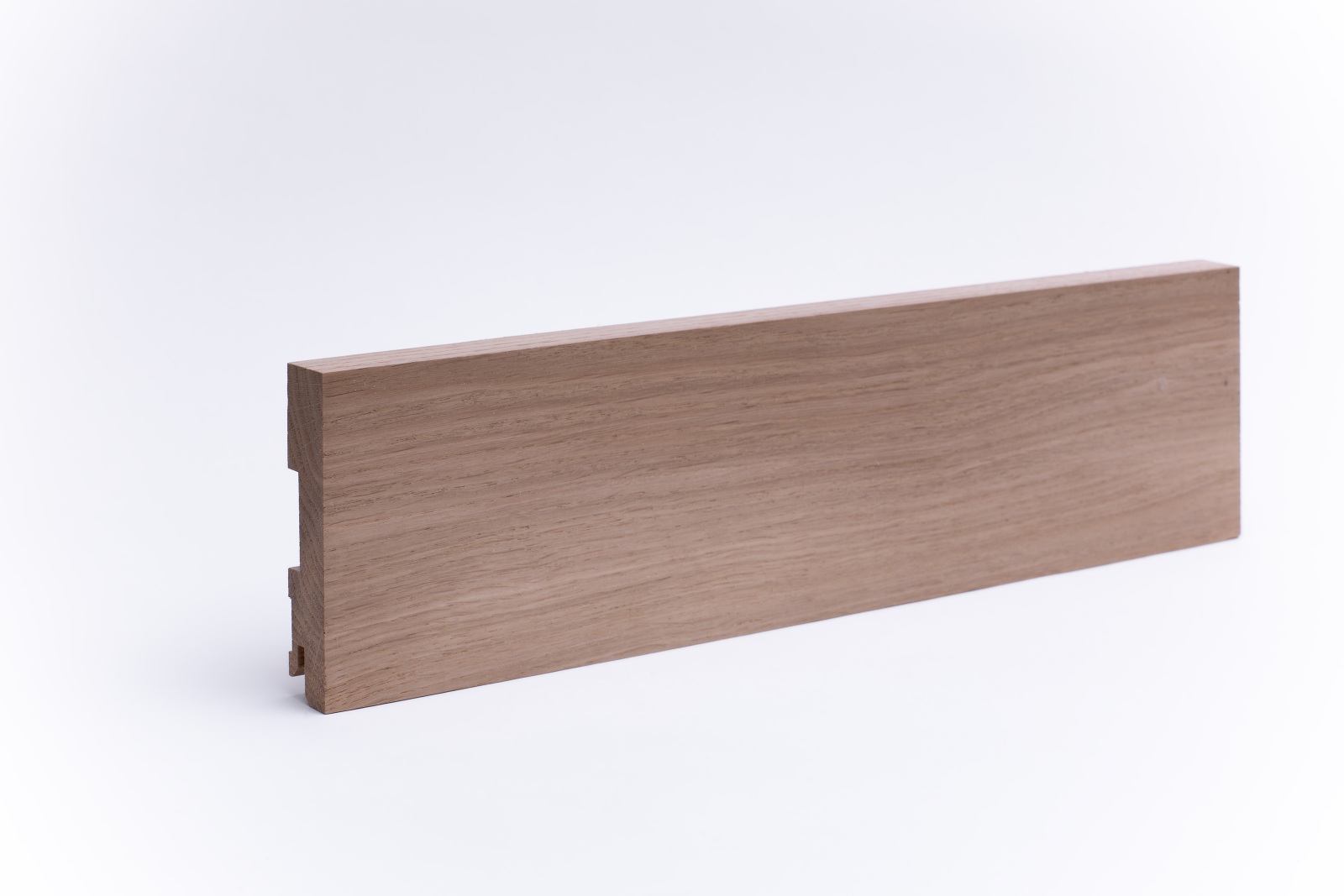 Plinthe de 120 mm de hauteur en bois de chêne massif avec profil carré. Rabotée et poncée. Les plinthes sont fabriquées à partir d'un seul morceau, tel que le tronc a poussé. Cela crée un aspect harmonieux dans la structure du bois et la couleur. Des nuds sont possibles.