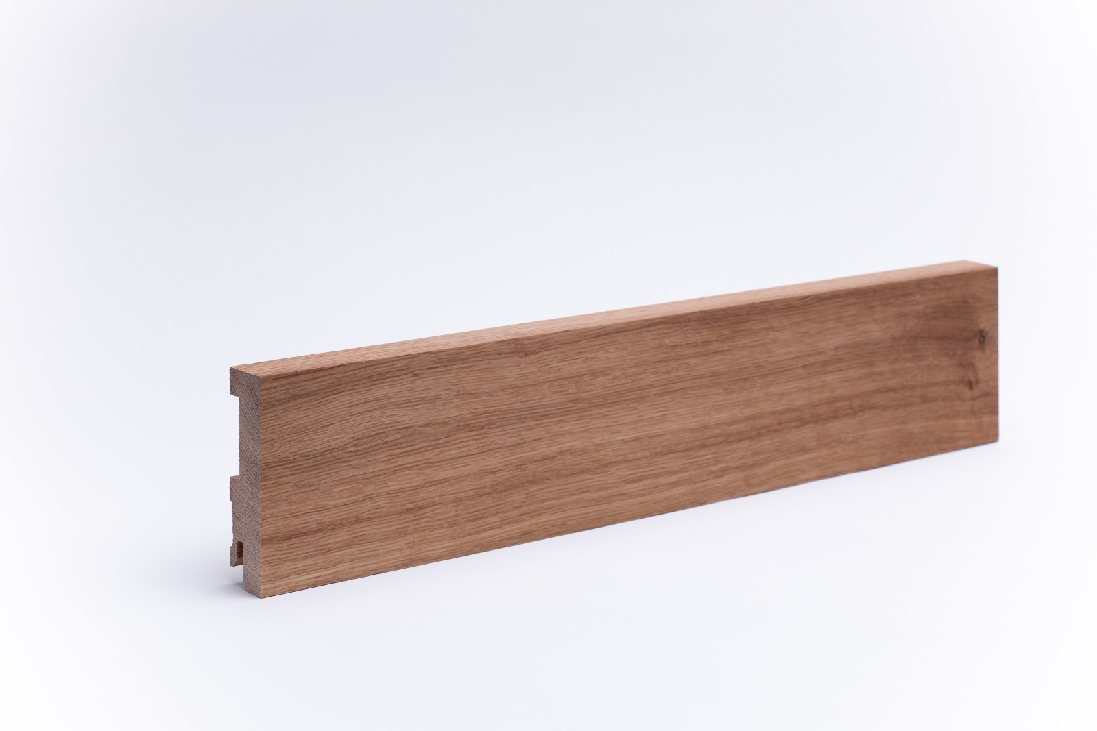 Plinthe de 80 mm de hauteur en bois de chêne massif avec profil carré. Rabotée et poncée. Les plinthes sont fabriquées à partir d'un seul morceau, tel que le tronc a poussé. Cela crée un aspect harmonieux dans la structure du bois et la couleur. Des nuds sont possibles.