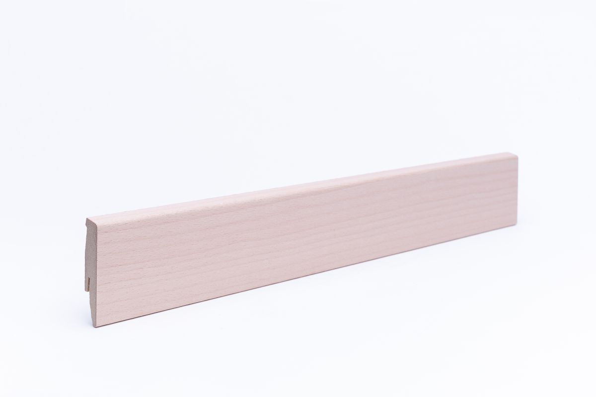 La plinthe est plaquée en bois de hêtre véritable. Cela lui confère un aspect hêtre naturel et une structure en bois , ainsi qu'une surface résistante aux rayures.