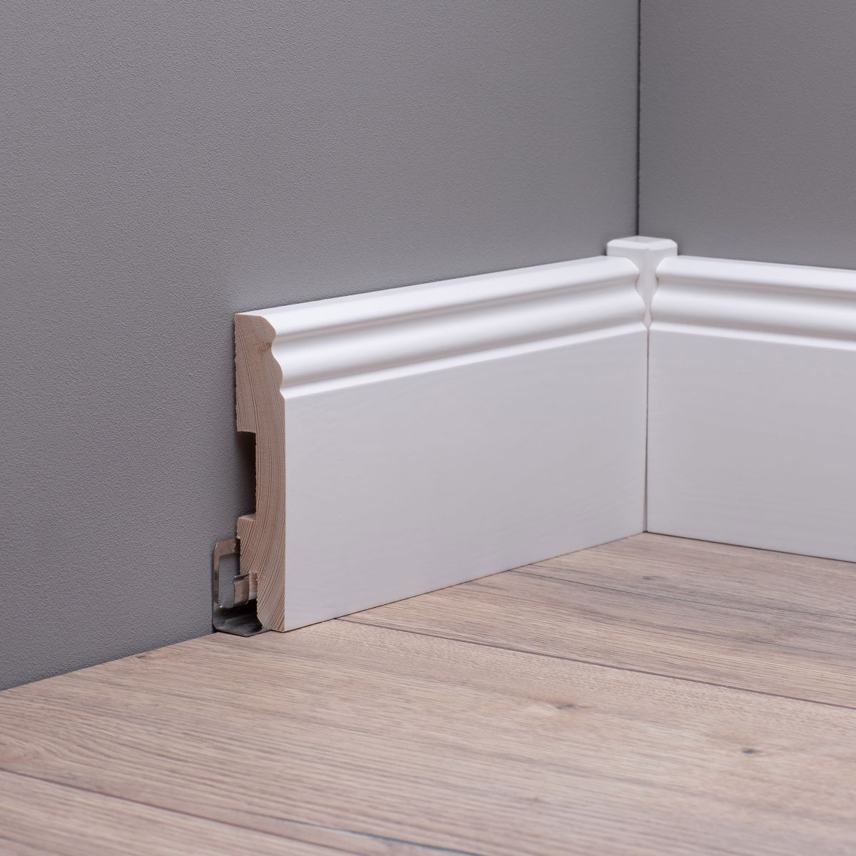 Plinthe blanche 80 mm RAL9016 profil berlinois - intemporelle, moderne et styléeNos plinthes blanches sont le classique absolu - intemporelles, stylées et magnifiques - elles s'adaptent tout simplement à tous les sols et styles d'aménagement.Ces plinthes sont fabriquées en bois massif de qualité supérieure, avec une surface laquée blanche couvrante et le fameux profil berlinois .Nos plinthes en bois massif de 80 mm sont livrées en version standard avec fraisage de clips.Aperçu des détailsEssence de bois : pin - bois certifié FSC Surface : laquage triple de haute qualité en blanc RAL9016 Profil berlinois Fixation : Montage par clips, collage ou vissage Dimensions du plafond : 20 x 80 x 2.400 mm Matériau : Les plinthes sont fabriquées en pin massif de haute qualité, ce qui leur confère une résistance et une durée de vie. La surface est laquée en blanc couvrant dans la teinte moderne RAL9016. Le vernis de haute qualité protège en outre le bois contre les influences extérieures et crée un magnifique aspect avec des veines de bois uniques.Montage:Le système pratique de clips permet de monter rapidement et facilement les plinthes au mur.En alternative, vous pouvez monter les plinthes avec de la colle pour plinthes, du ruban adhésif double face ou le kit de fixation.Remarque: Les accessoires nécessaires au montage, comme les clips ou la colle pour plinthes, doivent être commandés séparément.