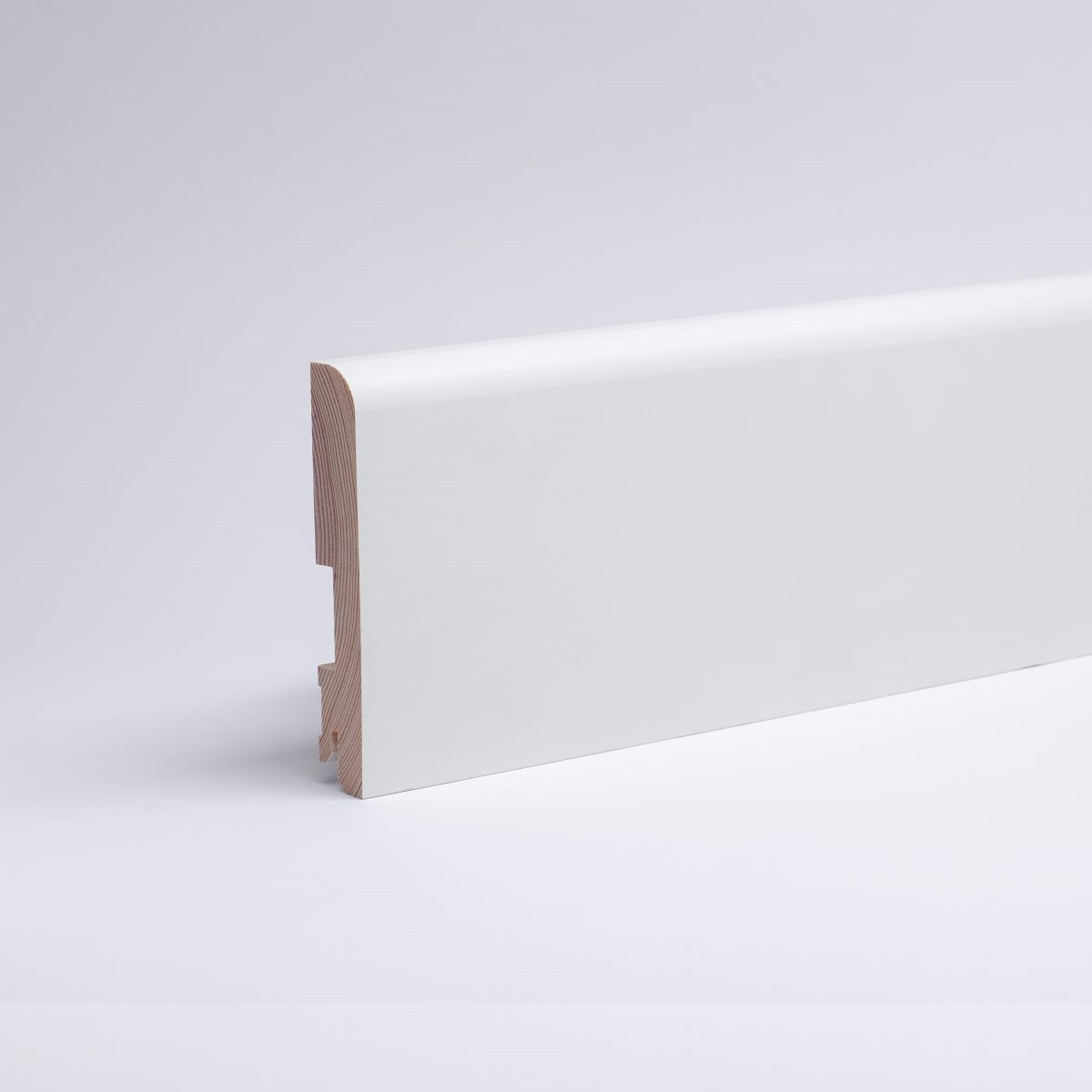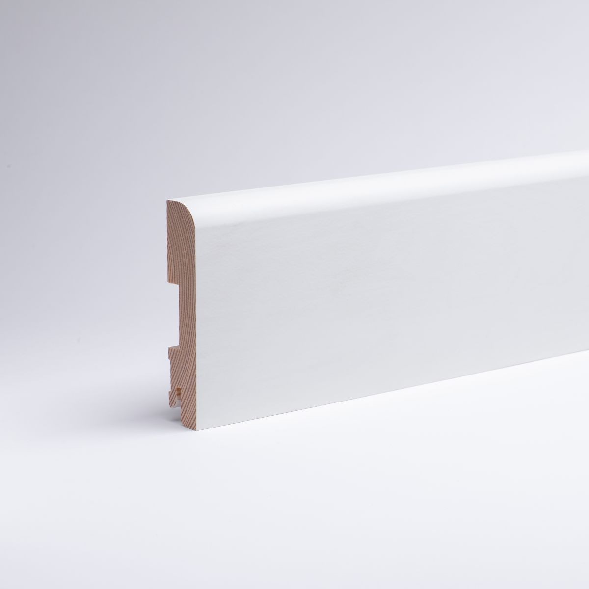 Plinthe en bois massif 60 mm arrondi RAL9016*Longueurs tombantes*Plinthe de 60 mm de haut en bois véritable massif avec bord avant arrondi. Laquée en RAL9016. Exécution standard avec fraisage de clips. En cas de demande spéciale en matière de dimensions ou de finition, n'hésitez pas à nous contacter! . Montage : Les plinthes sont fixées au mur par un clip de fixation, de la colle pour plinthes ou par des vis.Remarque : Nos longueurs tombantes sont des lattes en bois massif de différentes longueurs. Lors des commandes, nous nous efforçons d'obtenir un mélange de longueurs aussi homogène que possible. Les longueurs varient en fonction de la production. Les longueurs fixes ou souhaitées ne sont donc pas réalisables.