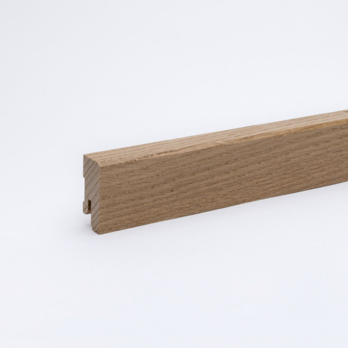 Plinthe en bois massif chêne brut - robuste - durable - intemporelle.Nous fabriquons nos plinthes haut de gamme carrées 100X16 mm en chêne massif. Ces plinthes en bois massif allient ainsi un design raffiné à une stabilité maximale, pour une transition parfaite entre le mur et le sol, ainsi qu'un aspect harmonieux de la pièce.Dans la version standard, nous fabriquons nos plinthes en bois massif avec un fraisage par clipsage pratique.Grâce au système pratique de clipsage, les plinthes se montent rapidement et facilement au mur.Aperçu des données.Essence de bois : chêneCarréDimensions : 100 X 16 mm Longueur : 1.000 - 2.400 mm longueurs tombantesSurface : brute, rabotée et poncéeFixation : Système de clips, collage, vis Matériau :Chaque pièce de bois est unique.Nos plinthes sont fabriquées à partir d'un seul morceau de chêne massif, tel que le tronc a poussé. Il en résulte une image très naturelle et harmonieuse dans la structure du bois et des couleurs, pour un effet agréable dans la pièce.Le bois de chêne offre de nombreuses propriétés positives, un veinage intense et est considéré comme très résistant. De par sa nature, le bois est très résistant aux intempéries et à l'usure. Les propriétés - robustesse, durabilité et longévité - du chêne sont particulièrement remarquables.En exécution "brute", vous avez la possibilité d'utiliser la moulure en bois massif de chêne, non traitée ou de la traiter ultérieurement. Par la teinture, le fumage, la lasure ou le vernis, vous pouvez personnaliser la plinthe selon vos souhaits.Montage:.Vous pouvez fixer les plinthes par collage ou par vis. Vous avez le choix entre un montage à l'aide de colle pour plinthes, de ruban adhésif double face ou du kit de fixation.Grâce à la version avec fraisage de clips, vous avez en outre la possibilité de fixer les plinthes au mur rapidement et facilement au moyen d'un système pratique de clips. Vous disposez ainsi d'une solution de montage rapide et propre avec le grand avantage - le démontage également rapide!En cas de travaux de rénovation, de déménagement de l'appartement ou de pose ultérieure de câbles, les plinthes en bois massif se laissent démonter, sans problème et sans destruction.