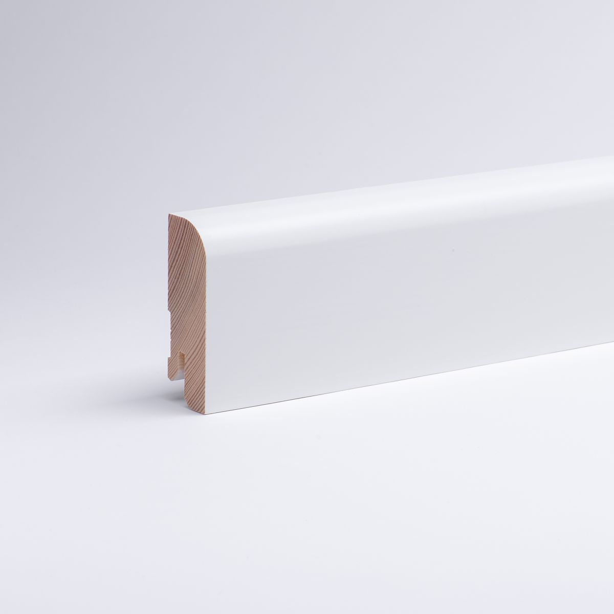 Plinthe en bois massif 100mm arrondi RAL9016*Longueurs tombantes*Plinthe de 100 mm de haut en bois véritable massif avec bord avant arrondi. Laquée en RAL9016. Exécution standard avec fraisage de clips. En cas de demande spéciale en matière de dimensions ou de finition, n'hésitez pas à nous contacter! . Montage : Les plinthes sont fixées au mur par un clip de fixation, de la colle pour plinthes ou par des vis.Remarque : Nos longueurs tombantes sont des lattes en bois massif de différentes longueurs.Lors des commandes, nous nous efforçons d'obtenir un mélange de longueurs aussi homogène que possible. Les longueurs varient en fonction de la production. Les longueurs fixes ou souhaitées ne sont donc pas réalisables.