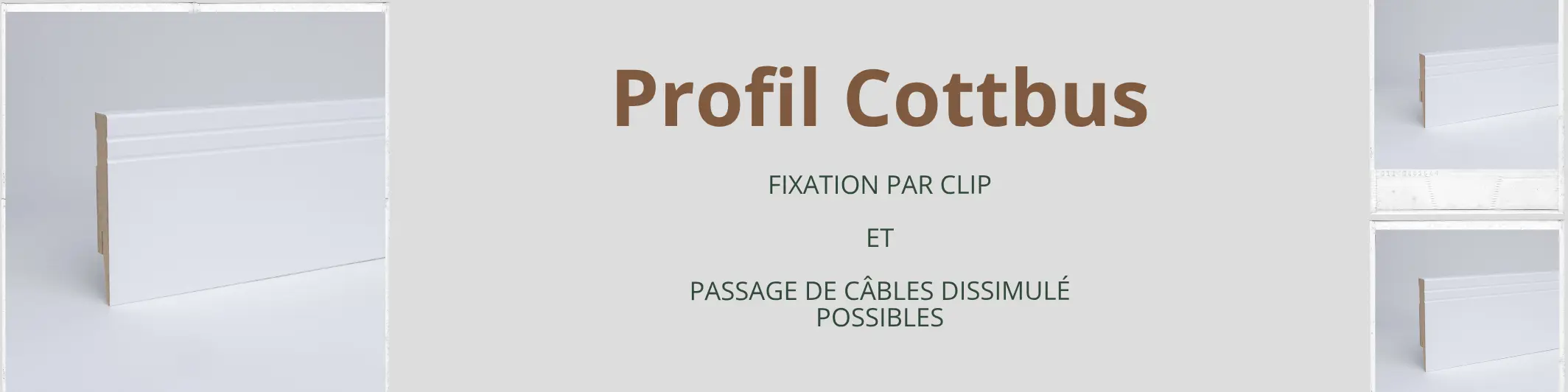 Plinthe profil Cottbusser 100 mm en blancNotre plinthe blanche au profil Cottbusser classique embellit chaque pièce grâce à son style sobre et intemporel. Grâce à leur système de clips simple, nos plinthes au profil Cottbusser se fixent facilement au mur. Elles sont disponibles dans les dimensions 17 mm x 100 mm x 2 400 mm. Noyau en MDF (panneau de fibres à densité moyenne) Revêtement décoratif « blanc » Forme : profil Cottbus Fixation : système à clip, collage ou vissage Dimensions : 17 x 100 x 2 400 mmMatériau :La plinthe est dotée d'un noyau en MDF (panneau de fibres de bois de densité moyenne). Celui-ci confère à la plinthe une flexibilité et une stabilité suffisantes.Le revêtement décoratif de qualité confère non seulement un aspect esthétique au profil Cottbusser, mais lui apporte également une protection supplémentaire. La surface est ainsi résistante aux rayures et garantit la longévité de la plinthe. Montage :Les plinthes sont fixées au mur à l'aide d'un système de clips et peuvent être démontées sans dommage si nécessaire, par exemple lors de travaux de rénovation. Le canal de câbles intégré vous permet de dissimuler les câbles derrière la plinthe. Vous pouvez également fixer les plinthes à l'aide de colle pour plinthes, de ruban adhésif double face ou du kit de fixation.