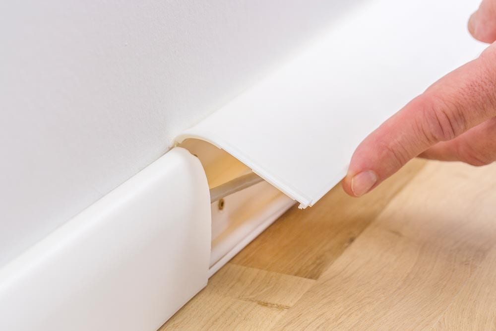 Plinthe en PVC Smart-Flex 70 mm en blanc - astucieuse et flexible Notre Smart Flex Strip de 70 mm est fabriquée en plastique robuste et couvre les joints de dilatation jusqu'à une largeur de 20,7 mm . La barre convainc par une surface lisse , un design mince et le montage facile et rapide grâce au système d'encliquetage . En raison de la construction astucieuse de la barre, il existe la possibilité pratique d'un passage de câble caché . Les lèvres d'étanchéité souples en haut et en bas de la barre servent à compenser les irrégularités et une finition exacte sur le mur et le sol. Détails en un coup d'il : Plinthe en plastique blanche étanche goulotte de câbles intégrée lèvres d'étanchéité en caoutchouc intégrées Dimensions : 20,7 x 70 x 2500 mm Assemblage : clouage, vissage ou collage Assemblage : Grâce au système d'encliquetage , les plinthes en plastique peuvent être installées rapidement et facilement . Le profil inférieur de la barre est simplement fixé au mur - au ras du sol . Il est assemblé à l'aide de clous ou de vis. Alternativement, il peut également être fixé avec un adhésif de montage ou un ruban adhésif double face. Maintenant, la partie visible de la plinthe est simplement encliquetée sur le sous-profil - Cela signifie qu'aucun clou ni aucune vis n'est visible . La cavité est parfait pour le acheminement de câbles dissimulé . Les câbles restent accessibles à tout moment . Lors d'une rénovation , l'astucieux système de clic garantit un démontage non destructif et rapide .