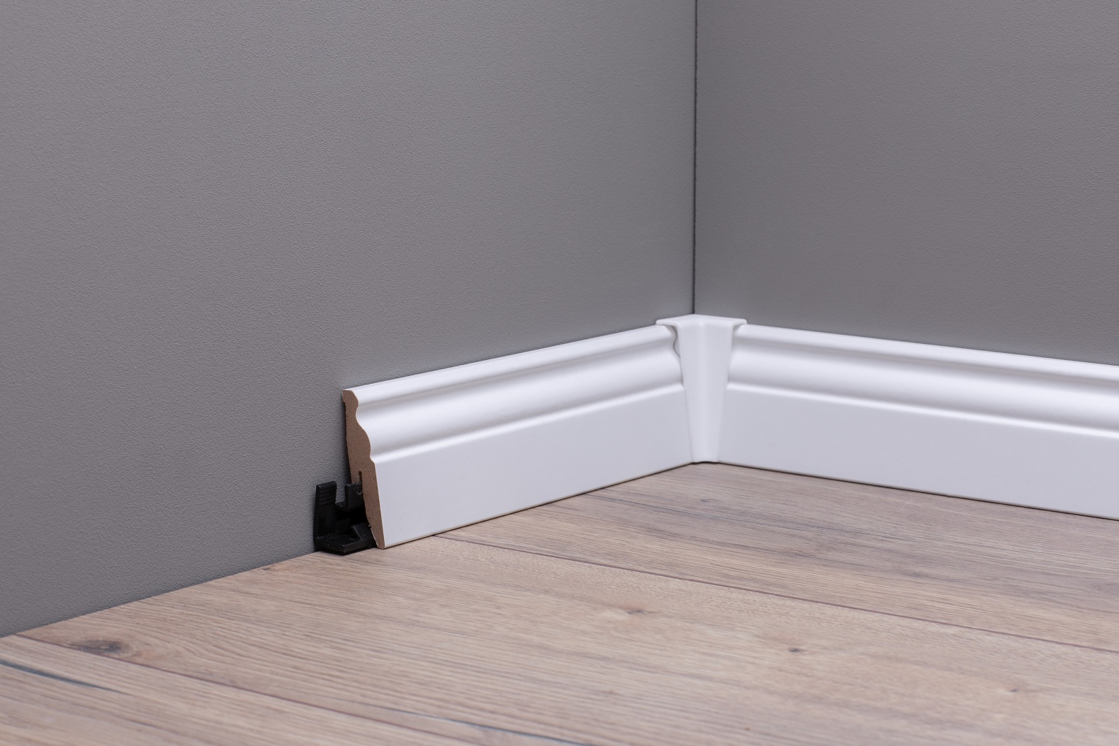 Assemblage: Les plinthes sont fixées sur le mur par un système de clips etpeuvent, en cas de besoin, p.ex. pour des travaux de rénovation, être enlevées sans être endommagées. Le passage de câbles intégré permet l'installation invisible des câbles derrière la plinthe.