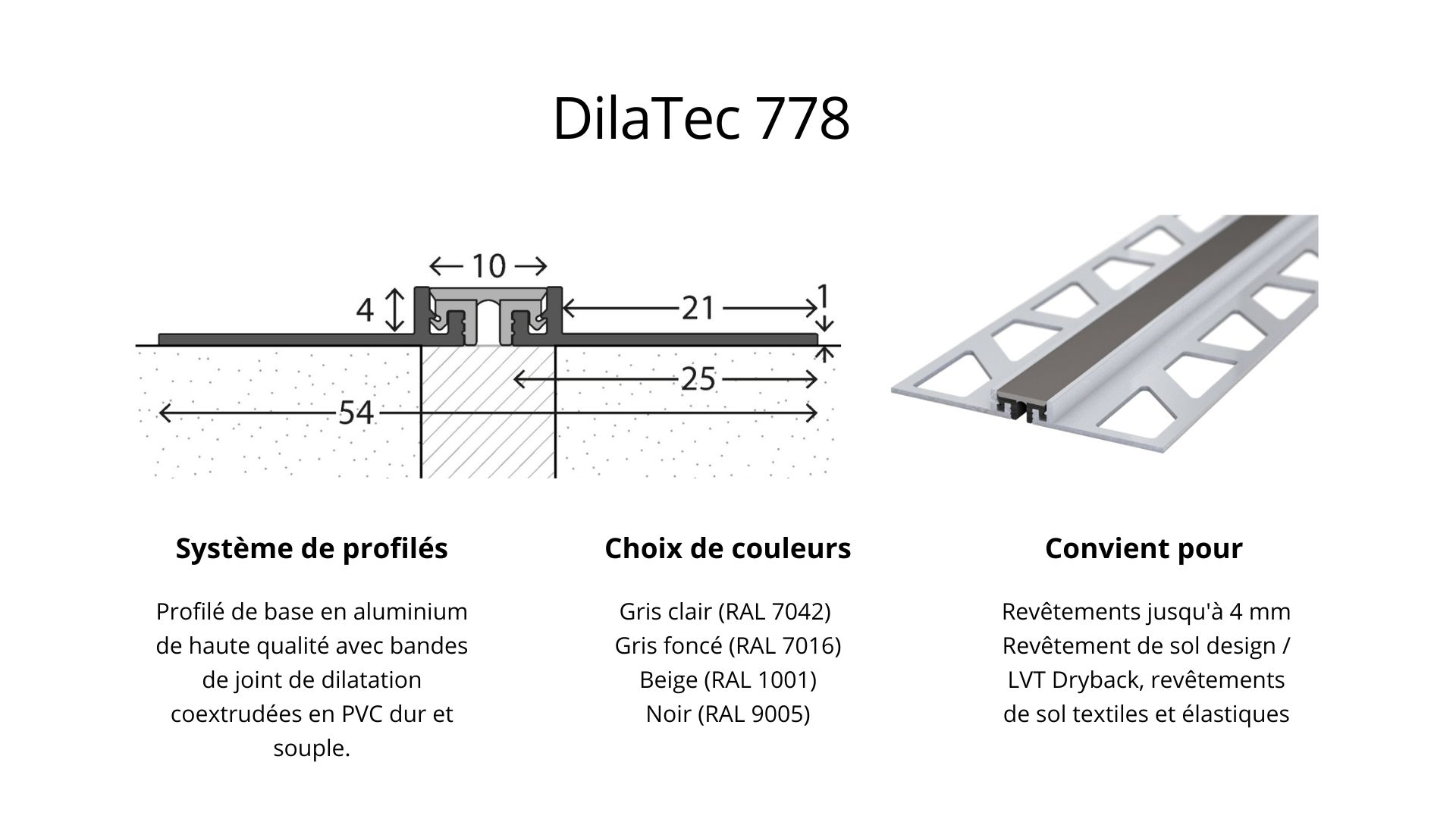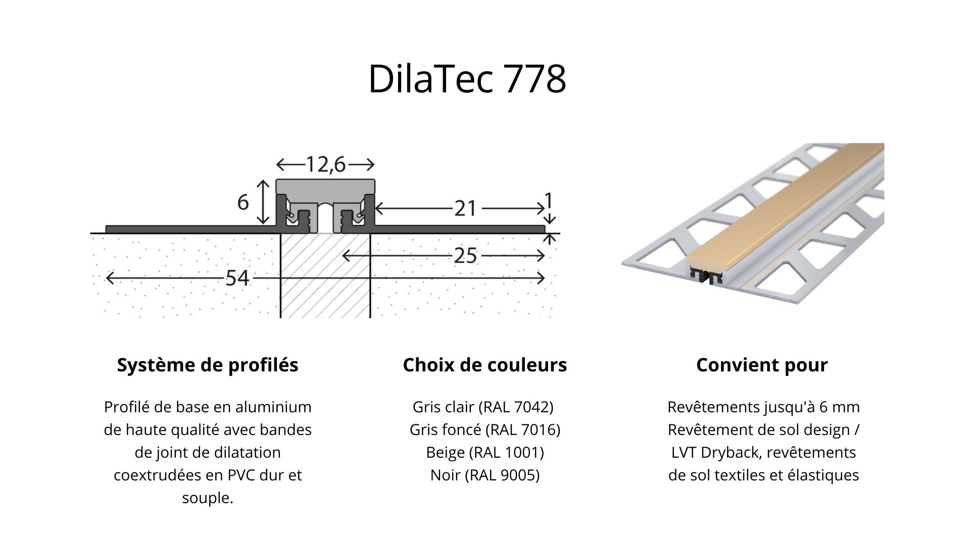 Système de joint de dilatation DilaTec - avec 2 profilés de base et une bande de joint de dilatation en plastique - pour revêtements de 4-6mm - gris clair 2,50mLes profilés de joint de dilatation prémontés sont idéaux pour une utilisation sur les joints de chape ou partout où la tension dans le sol doit être compensée.Les bandes de joint de dilatation en plastique peuvent être remplacées sans problème.Grâce à la coextrusion de PVC dur et souple, elles présentent un comportement de dilatation optimal. Ils absorbent en toute sécurité les tensions du support - sans se déchirer ni se déformer.de se détacher du profil.Les données en bref2 profilés de base de 25mm de large chacun, en aluminium.1 bande de joint de dilatation en plastique.Couleur du joint : gris clairConvient pour des revêtements de 4-6mmLongueur : 2.500 mm Hauteur x largeur : 7 x 54 mmConvient pour : Revêtement de sol design / LVT Dryback, Revêtements de sol textiles et élastiques Domaine d'application :Le profilé de joint de dilatation est utilisé pour tous les revêtements de sol pour ponter les joints de dilatation et de mouvement de construction. Le profilé est placé de telle sorte qu'il se trouve exactement au-dessus dujoint dans le support, afin que le joint de sol puisse continuer à bouger.Montage :Collage: . Utilisez une colle à deux composants ou à base de résine de coulée ou une colle avec un pouvoir adhésif particulièrement élevé.Après avoir collé le profilé, retirez l'excédent de colle de manière lisse. Respectez les instructions du fabricant. Veillez impérativement à ce que la colle ne pénètre pas dans le joint de sol.Encastrement: Vous pouvez également encastrer le profilé à l'aide de mastics appropriés. Veillez àtoujours choisir le profilé de manière à ce que la hauteur du profilé corresponde au revêtement de sol plus le mastic.l'enduit de rebouchage Après le durcissement de la colle, le revêtement de sol peut être découpé pour s'adapter au profilé. Nous recommandons d'utiliser ce profilé uniquement en combinaison avec des revêtements de sol collés.
