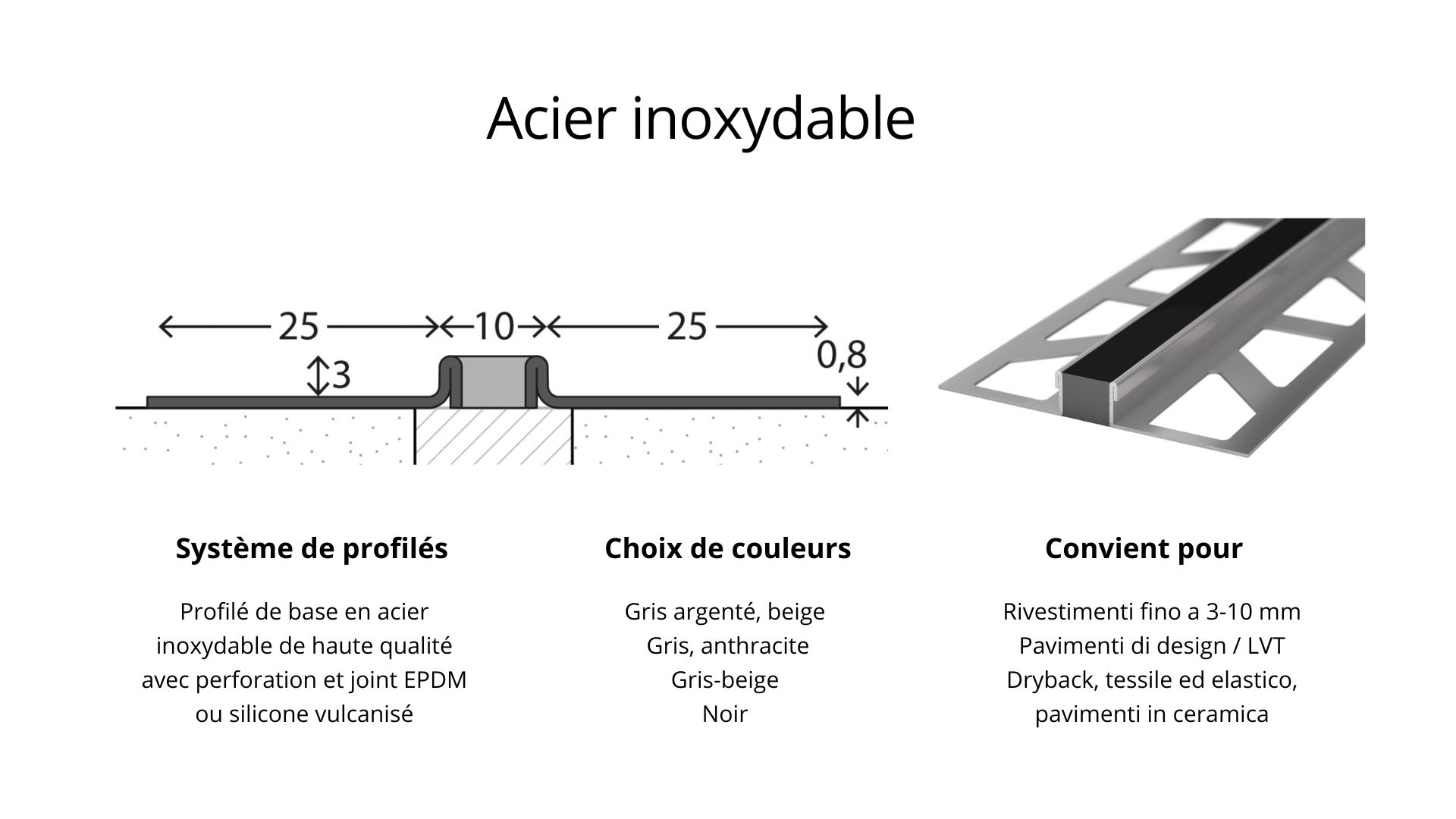 Profil de joint de dilatation en acier inoxydable - avec joint en silicone - pour revêtement de 4,5mm - noir 3m Les profilés pour joints de dilatation sont idéaux pour une utilisation sur les joints de chape ou partout où la tension dans le sol doit être compensée. Grâce au joint souple au milieu du profilé, les contraintes de compression et de traction sont compensées sans problème. Le profilé de joint de dilatation particulièrement résistant dispose d'un joint qui s'adapte discrètement à l'aspect régulier du joint. Les données en bref Profilé pour joint de dilatation en acier inoxydable. Joint silicone, vulcanisé Couleur du joint : noir Convient aux revêtements de 4,5mm Longueur : 3.000 mm Hauteur x largeur : 5,3 x 55 mm Convient pour : Revêtement de sol design / LVT Dryback, Revêtements de sol textiles et élastiques Domaine d'application : Le profilé de joint de dilatation est utilisé pour tous les revêtements de sol pour ponter les joints de dilatation et de mouvement de construction. Le profilé est placé de telle sorte qu'il se trouve exactement au-dessus du joint dans le support, afin que le joint de sol puisse continuer à bouger. Montage : Collage: . Utilisez une colle à deux composants ou à base de résine de coulée ou une colle avec un pouvoir adhésif particulièrement élevé. Après avoir collé le profilé, retirez l'excédent de colle de manière lisse. Respectez les instructions du fabricant. Veillez impérativement à ce que la colle ne pénètre pas dans le joint de sol. Encastrement: Vous pouvez également encastrer le profilé à l'aide de mastics appropriés. Veillez à toujours choisir le profilé de manière à ce que la hauteur du profilé corresponde au revêtement de sol plus le mastic. Après le durcissement de la colle, le revêtement de sol peut être découpé pour s'adapter au profil. Nous recommandons d'utiliser ce profilé uniquement avec des revêtements de sol collés.