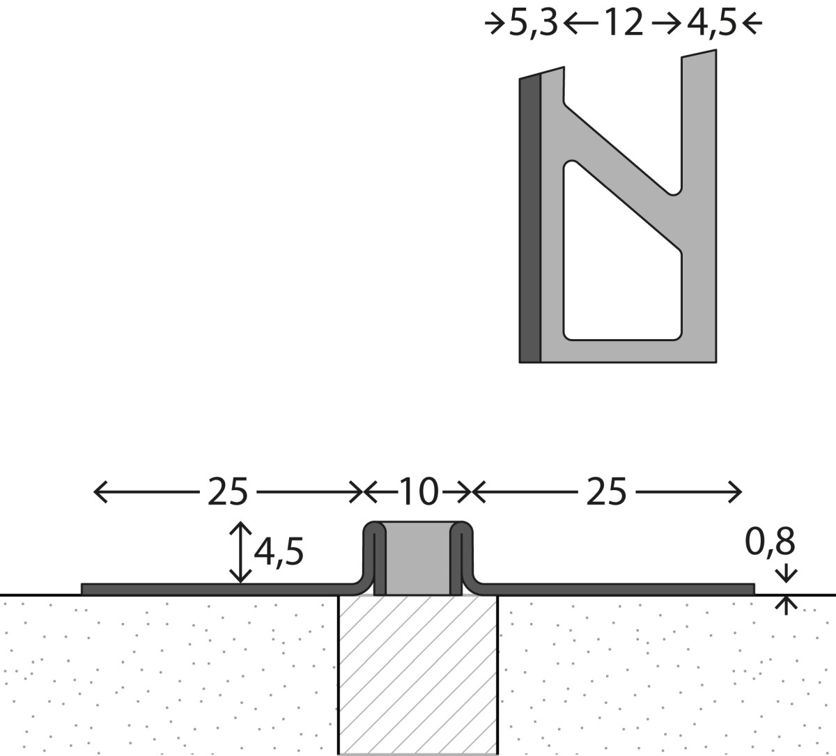Profil de joint de dilatation en acier inoxydable - avec joint en silicone - pour revêtement de 4,5mm - gris 3m Les profilés pour joints de dilatation sont idéaux pour une utilisation sur les joints de chape ou partout où la tension dans le sol doit être compensée. Grâce au joint souple au milieu du profilé, les contraintes de compression et de traction sont compensées sans problème. Le profilé de joint de dilatation particulièrement résistant dispose d'un joint qui s'adapte discrètement à l'aspect régulier du joint. Les données en bref Profilé pour joint de dilatation en acier inoxydable. Joint silicone, vulcanisé Couleur du joint : gris Convient aux revêtements de 4,5mm Longueur : 3.000 mm Hauteur x largeur : 5,3 x 55 mm Convient pour : Revêtement de sol design / LVT Dryback, Revêtements de sol textiles et élastiques Domaine d'application : Le profilé de joint de dilatation est utilisé pour tous les revêtements de sol pour ponter les joints de dilatation et de mouvement de construction. Le profilé est placé de telle sorte qu'il se trouve exactement au-dessus du joint dans le support, afin que le joint de sol puisse continuer à bouger. Montage : Collage: . Utilisez une colle à deux composants ou à base de résine de coulée ou une colle avec un pouvoir adhésif particulièrement élevé. Après avoir collé le profilé, retirez l'excédent de colle de manière lisse. Respectez les instructions du fabricant. Veillez impérativement à ce que la colle ne pénètre pas dans le joint de sol. Encastrement: Vous pouvez également encastrer le profilé à l'aide de mastics appropriés. Veillez à toujours choisir le profilé de manière à ce que la hauteur du profilé corresponde au revêtement de sol plus le mastic. Après le durcissement de la colle, le revêtement de sol peut être découpé pour s'adapter au profil. Nous recommandons d'utiliser ce profilé uniquement avec des revêtements de sol collés.