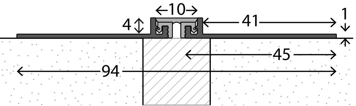 Système de joint de dilatation DilaTec - avec 2 profils de base et une bande de joint de dilatation en plastique - pour revêtements de 4-6mm - noir 3mLes profilés de joints de dilatation prémontés sont idéaux pour une utilisation sur les joints de chape ou partout où la tension dans le sol doit être compensée.Les bandes de joint de dilatation en plastique peuvent être remplacées sans problème.Grâce à la coextrusion de PVC dur et souple, elles présentent un comportement de dilatation optimal. Ils absorbent en toute sécurité les tensions du support - sans se déchirer ni se déformer.de se détacher du profil.Les données en bref2 profilés de base de 45mm de large chacun en aluminium.1 bande de joint de dilatation en plastique.Couleur du joint : noirConvient pour des revêtements de 4-6mmLongueur : 3.000 mm Hauteur x largeur : 7 x 94 mmConvient pour : Revêtement design / LVT Dryback, Revêtements de sol textiles et élastiques Domaine d'application :Le profilé de joint de dilatation est utilisé pour tous les revêtements de sol pour ponter les joints de dilatation et de mouvement de construction. Le profilé est placé de telle sorte qu'il se trouve exactement au-dessus dujoint dans le support, afin que le joint de sol puisse continuer à bouger.Montage :Collage: . Utilisez une colle à deux composants ou à base de résine de coulée ou une colle avec un pouvoir adhésif particulièrement élevé.Après avoir collé le profilé, retirez l'excédent de colle de manière lisse. Respectez les instructions du fabricant. Veillez impérativement à ce que la colle ne pénètre pas dans le joint de sol.Encastrement: Vous pouvez également encastrer le profilé à l'aide de mastics appropriés. Veillez àtoujours choisir le profilé de manière à ce que la hauteur du profilé corresponde au revêtement de sol plus le mastic.l'enduit de rebouchage Après le durcissement de la colle, le revêtement de sol peut être découpé pour s'adapter au profilé. Nous recommandons d'utiliser ce profilé uniquement en combinaison avec des revêtements de sol collés.