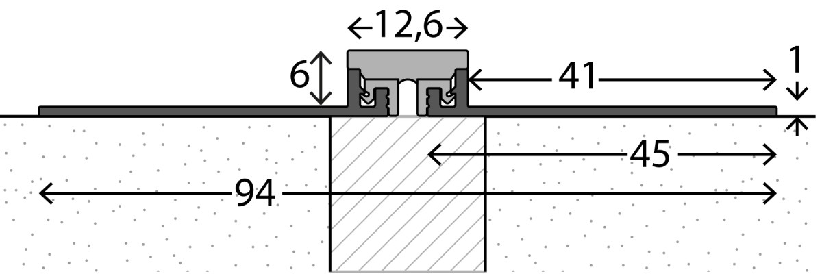 Système de joint de dilatation DilaTec - avec 2 profilés de base et une bande de joint de dilatation en plastique - pour revêtements de 4-6mm - gris clair 2,50mLes profilés de joint de dilatation prémontés sont idéaux pour une utilisation sur les joints de chape ou partout où la tension dans le sol doit être compensée.Les bandes de joint de dilatation en plastique peuvent être remplacées sans problème.Grâce à la coextrusion de PVC dur et souple, elles présentent un comportement de dilatation optimal. Ils absorbent en toute sécurité les tensions du support - sans se déchirer ni se déformer.de se détacher du profil.Les données en bref2 profilés de base de 45mm de large chacun en aluminium.1 bande de joint de dilatation en plastique.Couleur du joint : gris clairConvient pour des revêtements de 4-6mmLongueur : 2.500 mm Hauteur x largeur : 7 x 94 mmConvient pour : Revêtement de sol design / LVT Dryback, Revêtements de sol textiles et élastiques Domaine d'application :Le profilé de joint de dilatation est utilisé pour tous les revêtements de sol pour ponter les joints de dilatation et de mouvement de construction. Le profilé est placé de telle sorte qu'il se trouve exactement au-dessus dujoint dans le support, afin que le joint de sol puisse continuer à bouger.Montage :Collage: . Utilisez une colle à deux composants ou à base de résine de coulée ou une colle avec un pouvoir adhésif particulièrement élevé.Après avoir collé le profilé, retirez l'excédent de colle de manière lisse. Respectez les instructions du fabricant. Veillez impérativement à ce que la colle ne pénètre pas dans le joint de sol.Encastrement: Vous pouvez également encastrer le profilé à l'aide de mastics appropriés. Veillez àtoujours choisir le profilé de manière à ce que la hauteur du profilé corresponde au revêtement de sol plus le mastic.l'enduit de rebouchage Après le durcissement de la colle, le revêtement de sol peut être découpé pour s'adapter au profilé. Nous recommandons d'utiliser ce profilé uniquement en combinaison avec des revêtements de sol collés.