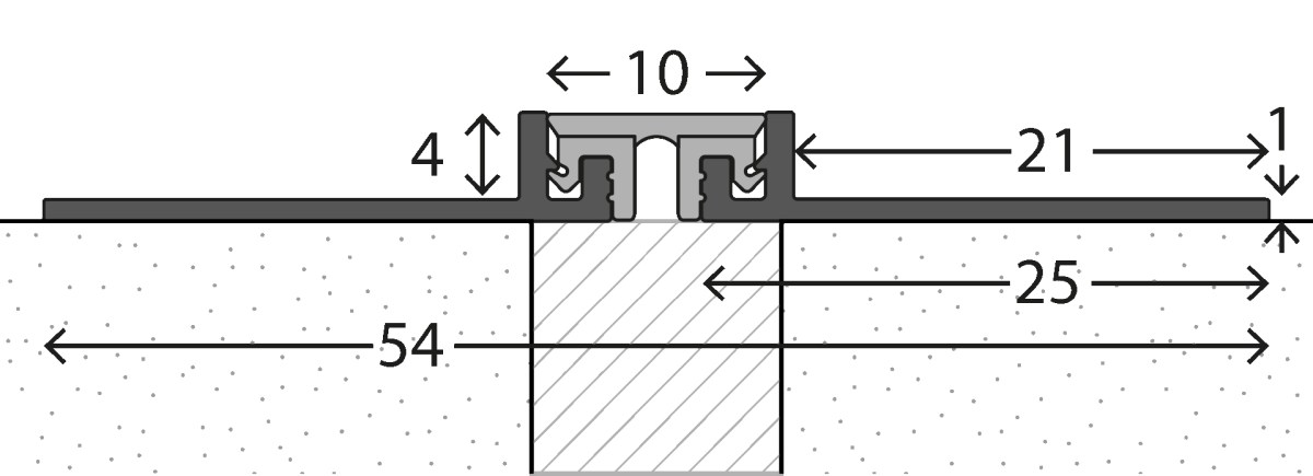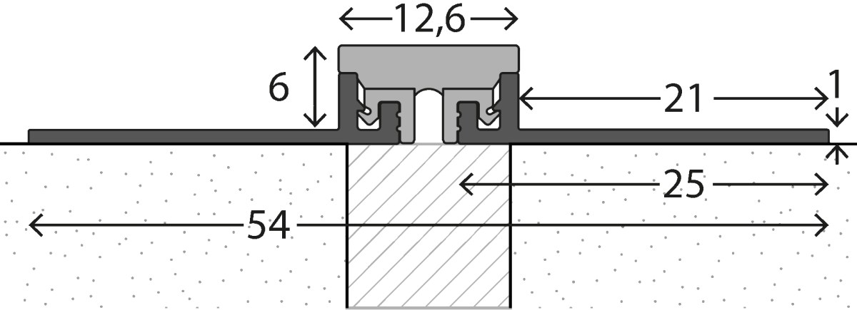 Profil de base pour joint de dilatation DilaTec 5 x 25 mm - aluminium - pour revêtements jusqu'à 6mm - 2,50m Important ! Il s'agit ici uniquement d'un profilé de base du système de joint de dilatation DilaTec! Le système de joints de dilatation DilaTec est idéal pour l'utilisation sur les joints de chape ou partout où la tension dans le sol doit être compensée. Les bandes de joint de dilatation en plastique, disponibles séparément, peuvent être remplacées sans problème. Grâce à la coextrusion de PVC dur et souple, elles présentent un comportement de dilatation optimal. Ils absorbent en toute sécurité les tensions du support - sans se déchirer ni se déformer. de se détacher du profil. Les données en bref 1 profilé de base en aluminium. Bande de joint de dilatation en plastique disponible séparément. Convient aux revêtements jusqu'à 6mm Longueur : 2.500 mm Hauteur x largeur : 5 x 25 mm Convient pour : Revêtement design / LVT Dryback, Revêtements de sol textiles et élastiques Domaine d'application : Le profilé de joint de dilatation est utilisé pour tous les revêtements de sol pour ponter les joints de dilatation et de mouvement de construction. Le profilé est placé de telle sorte qu'il se trouve exactement au-dessus du joint dans le support, afin que le joint de sol puisse continuer à bouger. Montage : Collage: . Utilisez une colle à deux composants ou à base de résine de coulée ou une colle avec un pouvoir adhésif particulièrement élevé. Après avoir collé le profilé, retirez l'excédent de colle de manière lisse. Respectez les instructions du fabricant. Veillez impérativement à ce que la colle ne pénètre pas dans le joint de sol. Encastrement: Vous pouvez également encastrer le profilé à l'aide de mastics appropriés. Veillez à toujours choisir le profilé de manière à ce que la hauteur du profilé corresponde au revêtement de sol plus le mastic. l'enduit de rebouchage Après le durcissement de la colle, le revêtement de sol peut être découpé pour s'adapter au profilé. Nous recommandons d'utiliser ce profilé uniquement en combinaison avec des revêtements de sol collés.