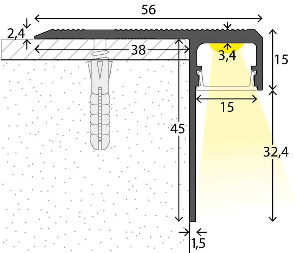 Profil de nez de marche LED 218 - Mettez les accents avec la technologie LED Révolutionnez le monde de la vie avec la technologie LED. Grâce à cette technologie peu coûteuse et longue durée , la lumière peut être utilisée dans presque tous les domaines - que ce soit pour des raisons de conception ou aspects de sécurité b>. Le profilé nez de marche 218 dispose d'un canal LED qui émet de la lumière vers le bas. L'étape ci-dessous est éclairée de manière optimale. Ceci n'est pas seulement pour la sécurité, mais crée également une atmosphère chaleureuse. Le canal LED peut être équipé de autocollants disponibles dans le commerce. Les bandes LED B>peuvent être équipées jusqu'à une largeur de 10 mm. Remarque : Ceux-ci ne sont pas inclus dans la livraison. Détails en un coup d'il : Nez de marche LED n° 218, noirmatériau : aluminiumtrous de vis à tête fraiséeémission lumineuse vers le basDiffuseur LED disponible séparément : "04030723-00"Dimensions : 56 x 16 x 2 500 mm Domaine d'application : Le profilé nez de marche à LED 218 est utilisé de préférence lorsque la marche et la contremarche ont déjà été pourvues d'un revêtement de sol. L'épaisseur du revêtement de sol n'a pas d'importance. Le profilé est donc idéalement adapté à la rénovation de marches existantes. De plus, grâce à sa construction stable , le profilé permet d'allonger les surfaces de marche jusqu'à à 17 mm.< / P>Assemblage : Le profilé est vissé sur les bords de marche mentionnés ci-dessus à l'aide de chevilles et vis à tête fraisée appropriées précisément sur les marches existantes au-dessus du revêtement de sol posé. Assurez-vous qu'il y a de la place pour d'éventuels câbles pour l'éclairage LED . Un volet translucide clipsable est disponible en option pour fermer le canal LED. Il n'est pas absolument nécessaire de l'utiliser. Le diffuseur LED peut être commandé séparément.