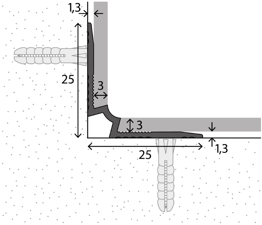 Angle intérieur nez de marche 25 x 25 mm - argentNez de marche pour revêtement design jusqu'à 3 mm, pour la pose en pleine surface de revêtement design sur les marches. Les angles intérieurs assortis protègent également les bords du revêtement dans l'angle intérieur entre la marche et la contremarche.SpécificationsProfilé aluminium, argentDimensions 25 x 25 x 2 500 mmpour revêtements design / LVT, revêtements de sol résilients de 2 à 3 mmtrous de vis fraisésIl faut 15 vis et chevilles pour le montage, celles-ci ne sont pas incluses dans la livraison