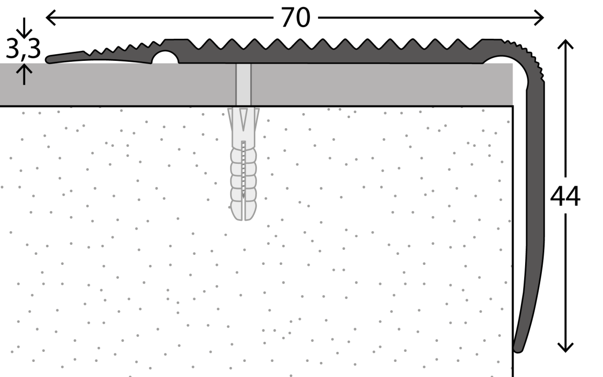Profil de nez de marche n° 271 - noir, revêtu par poudre.Profil de nez de marche pour revêtements design de 2-3mm, avec insertion pour une finition propre et belle de tous les bords comme les escaliers, les paliers ou les saillies.Des bandes d'une largeur de 38,5-40 mm sont découpées dans le sol design et insérées ultérieurement dans l'insert du profilé.Données techniquesProfilé en aluminium, revêtu par poudre noirDimensions 13,7 x 44,6 x 3.000 mmInsertion pour bandes de 28,5-40 mm de largePour revêtements de sol design / LVT, revêtements de sol élastiques de 2-3 mmtrous de vis encastrés