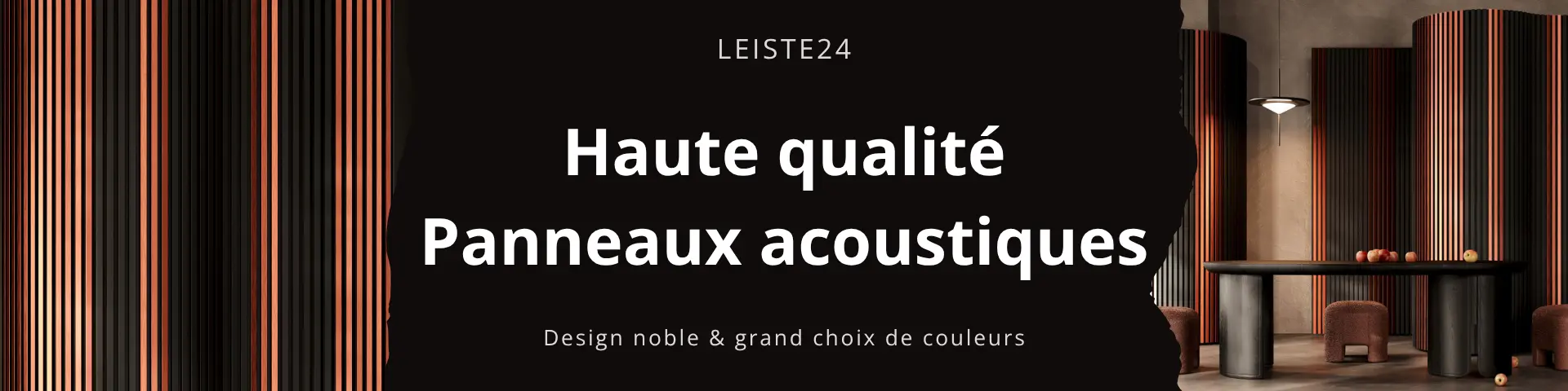 Panneau acoustique Acoustic+ 2400 x 600 mm Cuivre - Feutre acoustique noirPanneaux acoustiques haut de gamme dotés de la technologie CleanEdge : pas de bords visibles, un aspect lamellé moderne et une acoustique ambiante nettement amélioréeApportez plus de profondeur, de structure et de sérénité à vos pièces. Les panneaux acoustiques Acoustic+ de Leiste24 allient un aspect lamellaire moderne à une isolation acoustique fonctionnelle et une finition haut de gamme. Idéaux comme revêtement mural pour les pièces à vivre, les bureaux ou les couloirs particulièrement adaptés aux aménagements muraux modernes sur de grandes surfaces.Technologie CleanEdge la différence visible Lamelles entièrement recouvertes sans bords coupés apparents Un aspect soigné et haut de gamme sous tous les angles Nettement plus élégant que les panneaux acoustiques classiques aux bords MDF apparentsPourquoi choisir les panneaux acoustiques Acoustic+ de Leiste24 ? Améliorent sensiblement l'acoustique de la pièce Aspect moderne de mur à lamelles pour plus de profondeur et de structure Montage simple par collage ou vissage Finition haut de gamme pour des solutions murales durablesDétails du produit Lamelles en MDF avec placage décoratif de qualité en cuivre Dimensions : 2400 x 600 x 20 mm Feutre : noir (8 mm d'épaisseur) Matériau : MDF Dimensions des lamelles : 27 mm de largeur et 12 mm d'épaisseur Espacement entre les lamelles : 16 mm Panneaux muraux entièrement pré-assemblés Montage Le revêtement à lamelles est très rapide et facile à monter. Vous pouvez soit coller, soit visser les panneaux acoustiques au mur. Pour le plafond, nous recommandons de E coller et visserE en E combinaisonE La combinaison parfaite entre design et fonctionnalité pour des pièces qui ne sont pas seulement esthétiques, mais aussi plus agréables à vivre.